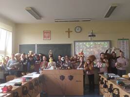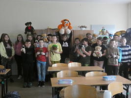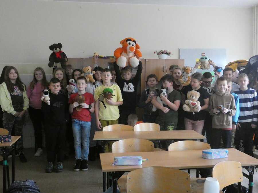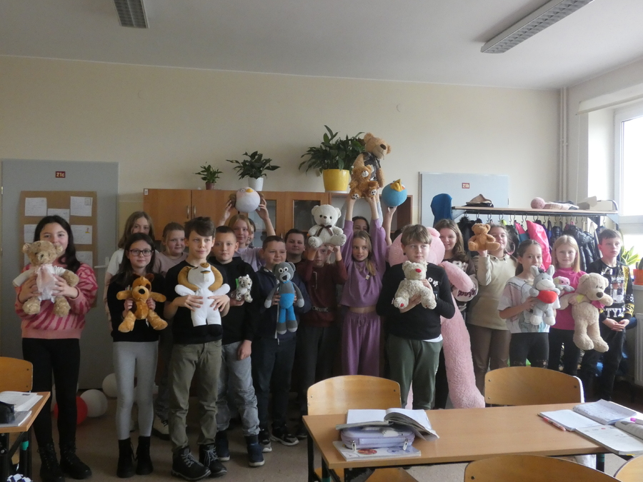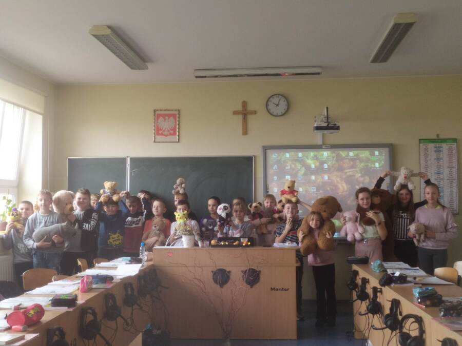 Uczniowie wykonali również pamiątkowe zdjęcia z obchodów Dnia Pluszowego Misia.