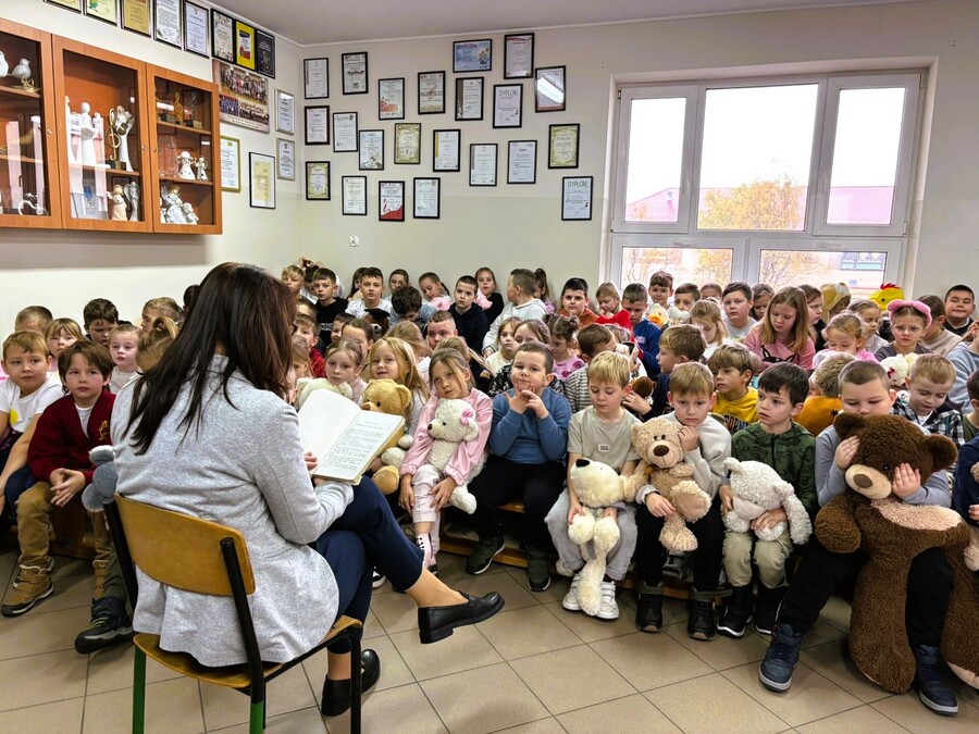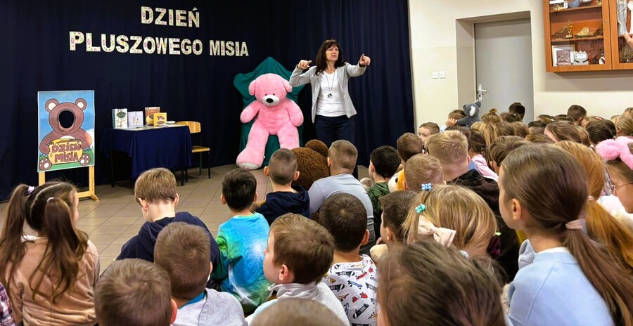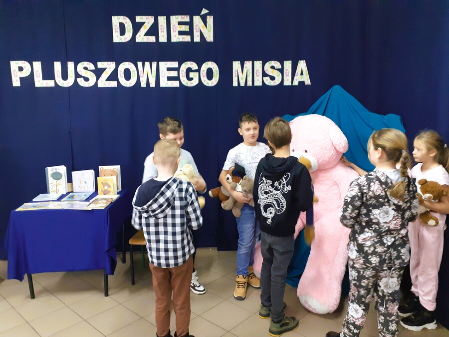 Każdego roku w te obchody włącza się również biblioteka szkolna. W tym roku na łączniku przygotowane zostało spotkanie z Misiem dla uczniów klas I-III. Nauczyciel bibliotekarz – pani Ewa Gaze opowiedziała dzieciom historię powstania zabawki, a także przeczytała krótką historię misia Nalle. Podczas spotkania dzieci uczyły się piosenki „Misiu mój, misiu mój”, opowiadały jakie znają misie zarówno książkowe jak i filmowe oraz uczyły się również wiersza o Misiu. Każdy miał okazję na przytulanie się do ogromnego bibliotecznego misia oraz skorzystać z misiowej fotobudki. Wydarzeniu towarzyszyła wystawa książek, których bohaterem jest MIŚ, a które chętni uczniowie mogli jeszcze dziś wypożyczyć.