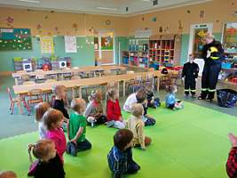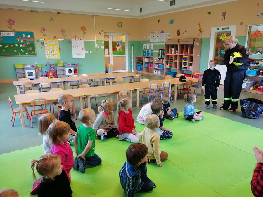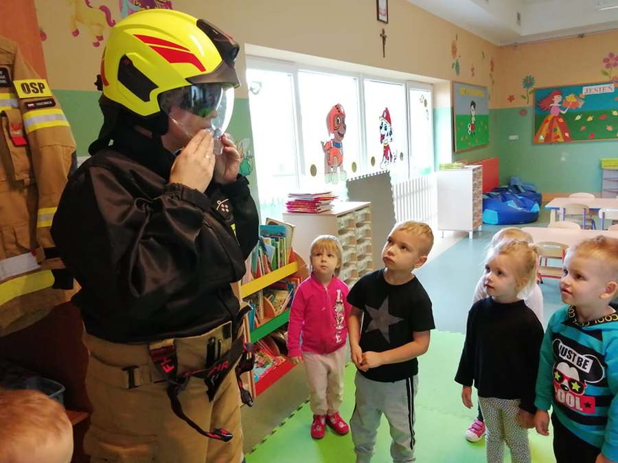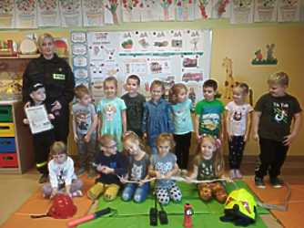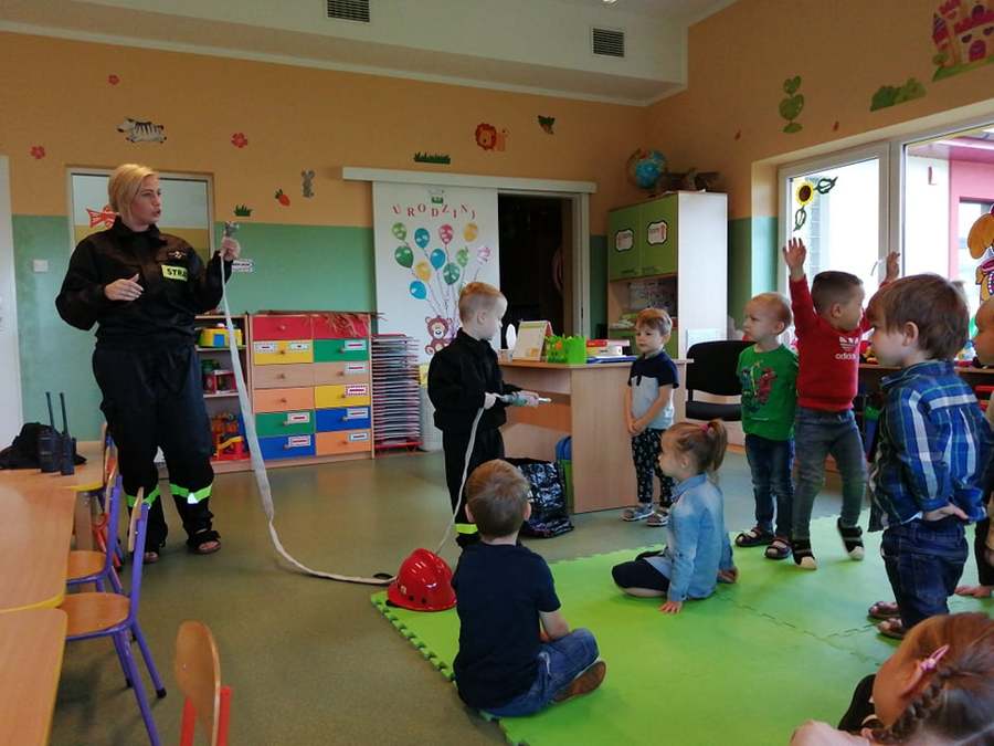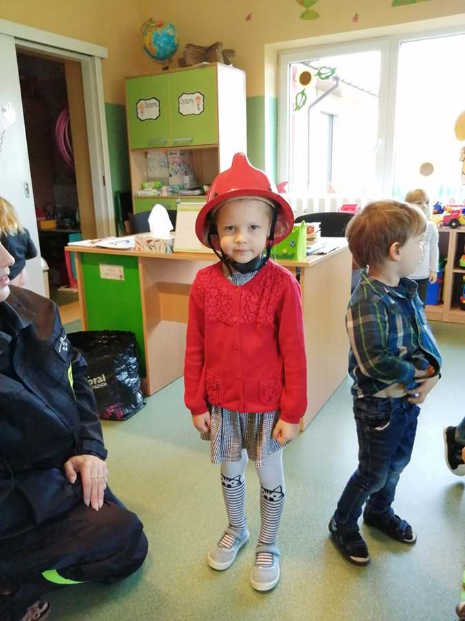 Dzieciom z młodszych grup przedszkolnych „Jeżyki” i „Krasnoludki” tematykę związaną ze strażą pożarną przybliżyła pani Sylwia Grześniak pracownik Przedszkola w Trzcinicy i jednocześnie druhna OSP w Trzcinicy. Dzieci zobaczyły z bliska strój strażaka, mogły przymierzyć hełm, poznały akcesoria wykorzystywane przez strażaków w akcjach.