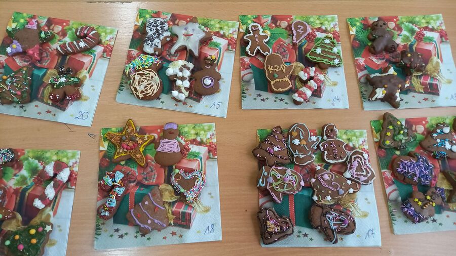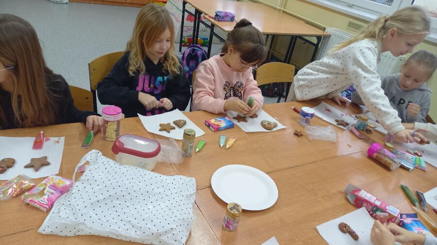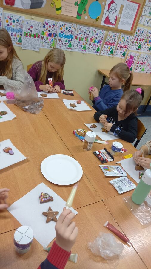 W okresie przedświątecznym uczniowie klasy IIa wraz ze swoją wychowawczynią - panią Renatą Mikołajczyk, oddali się bez reszty jednej z najbardziej ulubionych przez dzieci tradycji bożonarodzeniowych - zdobieniu świątecznych pierniczków. Wcześniej już upieczone ciastka wypełniły klasę świątecznym, korzennym zapachem, a uczniowie z zapałem zajęli się ich dekorowaniem. Dzieci prześcigały się w tworzeniu przepięknych, barwnych wzorów wykazując się przy tym dużą kreatywnością.