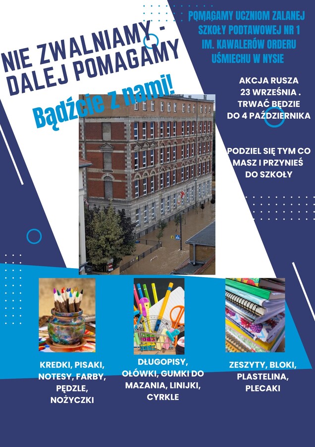 Chcemy pomóc dzieciom z zalanych terenów. Będzie to pomoc skierowana do konkretnej szkoły. Naszą akcją chcemy objąć Szkołę Podstawową Nr 1 im. Kawalerów Orderu Uśmiechu w Nysie. Na dzień dzisiejszy wiemy, że uczniowie nie mają możliwości powrotu do tej szkoły – organizowane są im zajęcia opiekuńcze w innych szkołach.