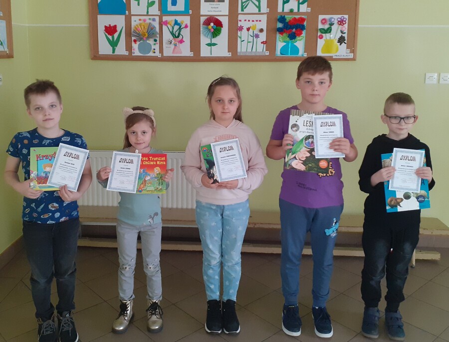 Amelia Ozimek kl. IIa, Nataniel Gaze, Wiktoria Matysiak i Zuzia Poniatowska w kl. II b, Oliwier Mrugała kl. III a i Wiktor Zimoch w kl. III b.
