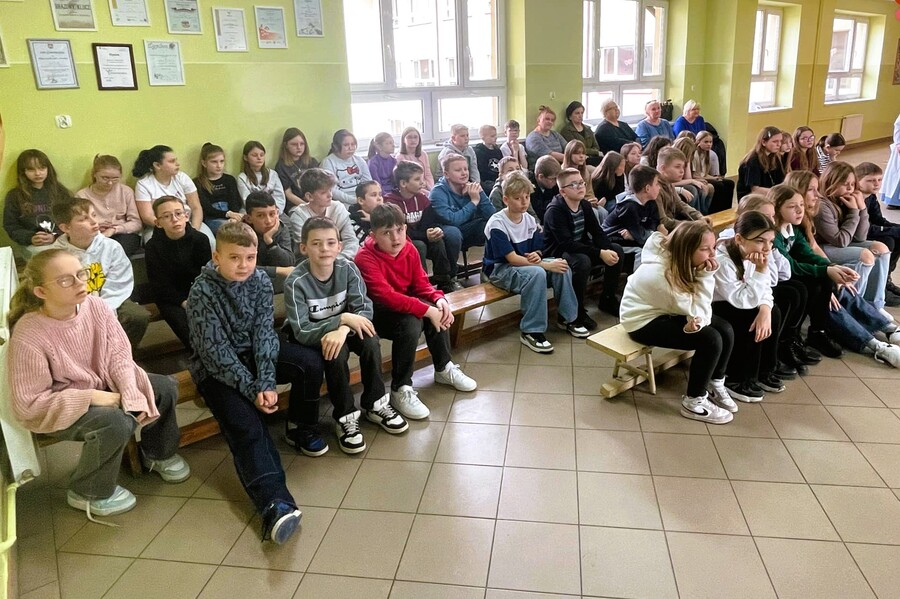 Odwiedzili tego dnia również swoich młodszych kolegów z klas I-III informując ich o obchodzonym święcie oraz przedstawiając prezentowane postacie.