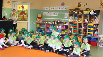Złożyć uroczyste przyrzeczenie o następującej treści: „… co dzień rano buzię mieć roześmianą, chodzić na spacery daleko, pilnie wypijać mleko, słuchać pani, sprzątać ładnie, żeby w sali było składnie…”.