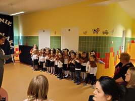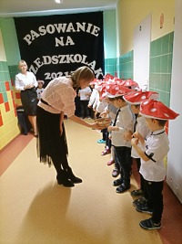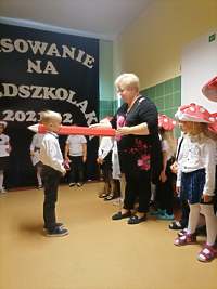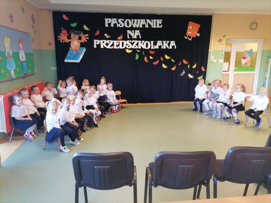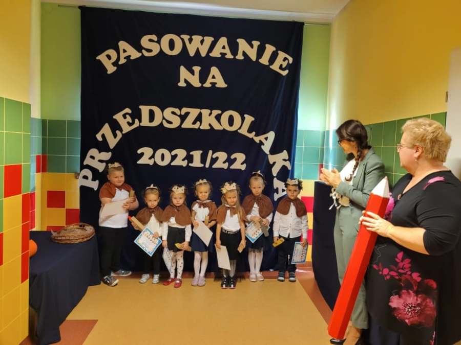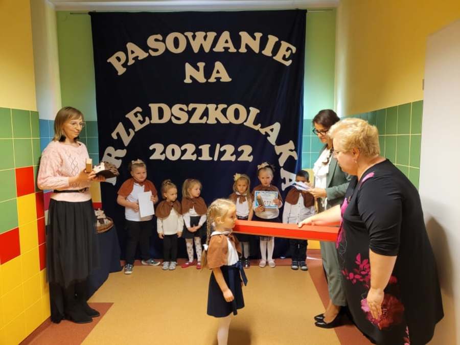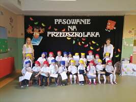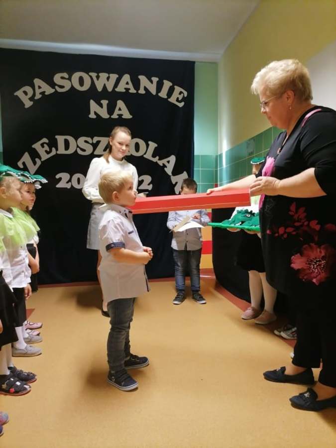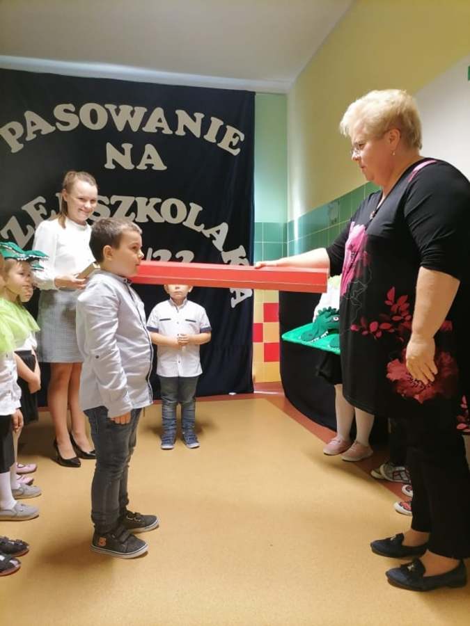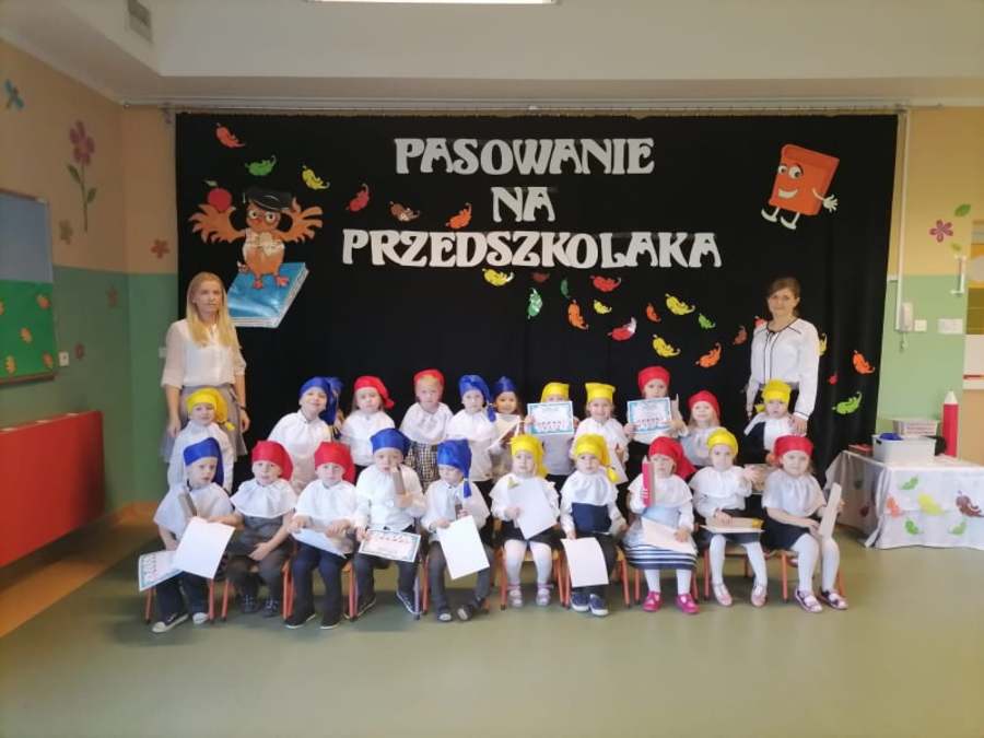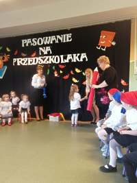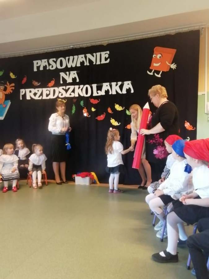 Po odśpiewaniu hymnu przedszkolnego i prezentacji krótkiej części artystycznej nastąpiło pasowanie. Pani wicedyrektor Ewa Hetmańczyk, przy użyciu olbrzymiej kredki, pasowała dzieci na przedszkolaków. Na pamiątkę dzieci otrzymały dyplomy oraz drobne upominki ufundowane przez Radę Rodziców.