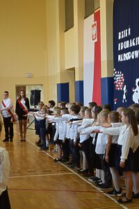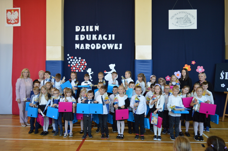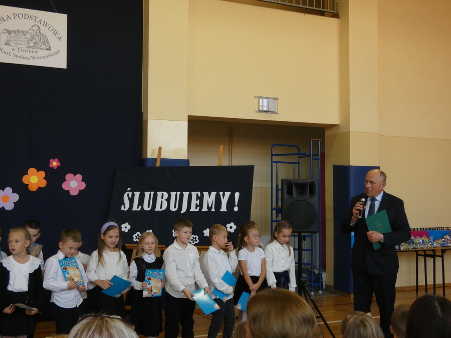 Pierwszoklasiści złożyli uroczyste ślubowanie, a tuż po nim Dyrektor Szkoły w Trzcinicy pasowała każdego z nich na ucznia. Na pamiątkę tego wydarzenia uczniowie otrzymali dyplomy, a rodzice z tej okazji przygotowali dla swoich dzieci prezenty. Upominki pierwszoklasistom wręczyła również przewodnicząca Rady Rodziców. Wójt Gminy Trzcinica, Dyrektor Zespołu Szkół w Trzcinicy i przewodnicząca Rady Rodzów złożyli pierwszoklasistom życzenia, aby w szkole zdobywali wiedzę, umiejętności, rozwijali swoje pasje, zainteresowania i dobrze się w niej czuli.