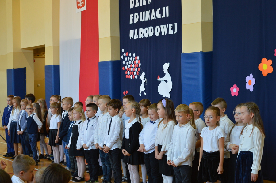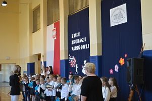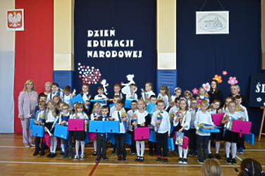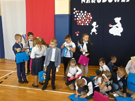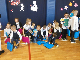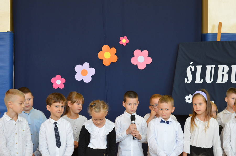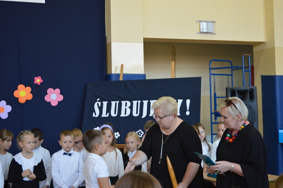 Pierwszoklasiści zaprezentowali część artystyczną, przygotowaną pod kierunkiem wychowawczyń: Urszuli Jokiel i Laury Pelińskiej. Recytowali, śpiewali, odpowiadali na pytania, tańczyli i wykonywali różne zadania, wszystko po to, aby pokazać, że zasługują na miano uczniów.