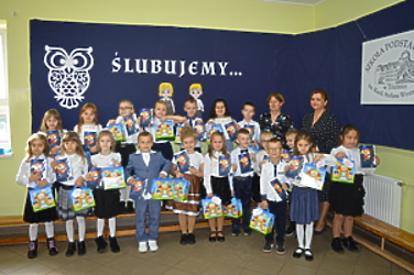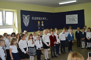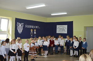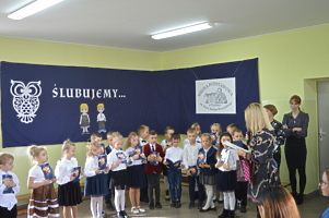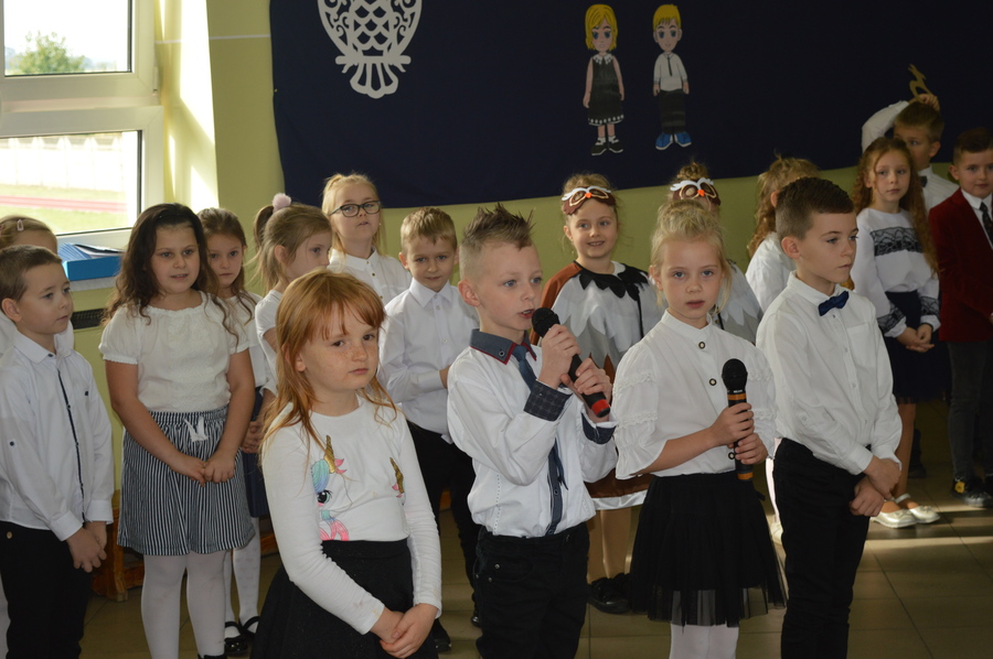Pierwszoklasiści zaprezentowali część artystyczną przygotowaną pod kierunkiem wychowawczyń Klaudii Góralczyk i Beaty Stodółki. Śpiewali piosenki, wykonywali zadania, wszystko po to, aby pokazać, że zasługują na miano uczniów.