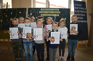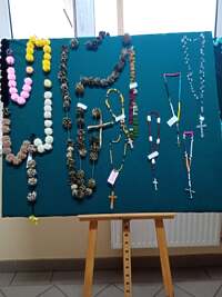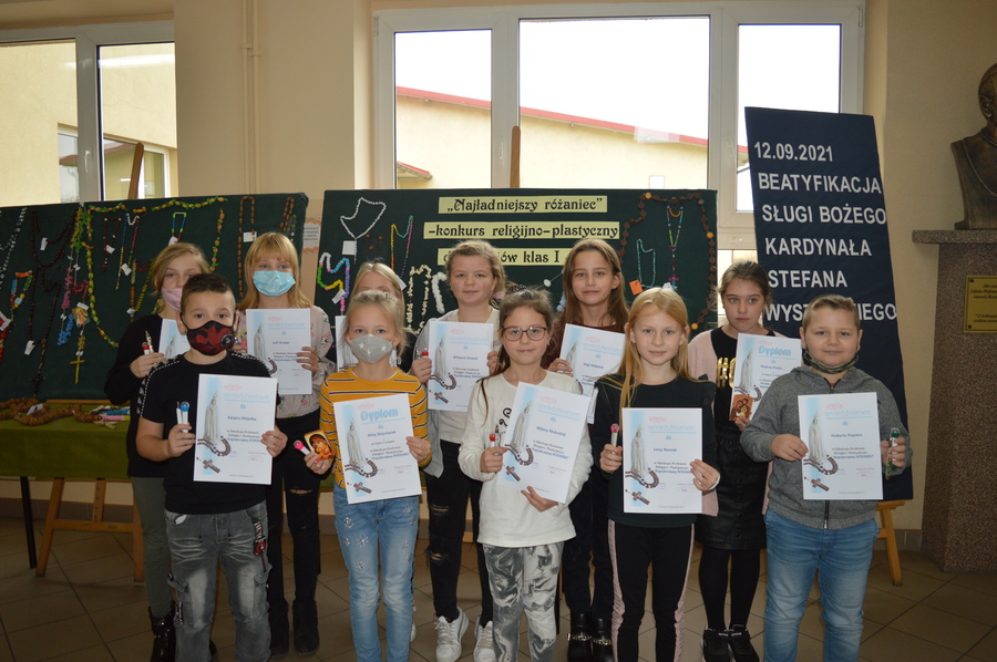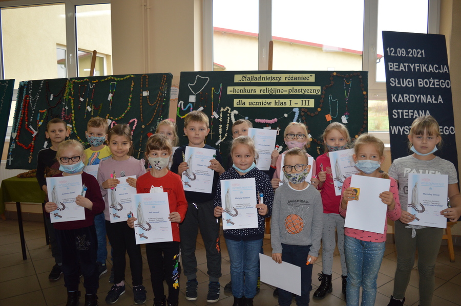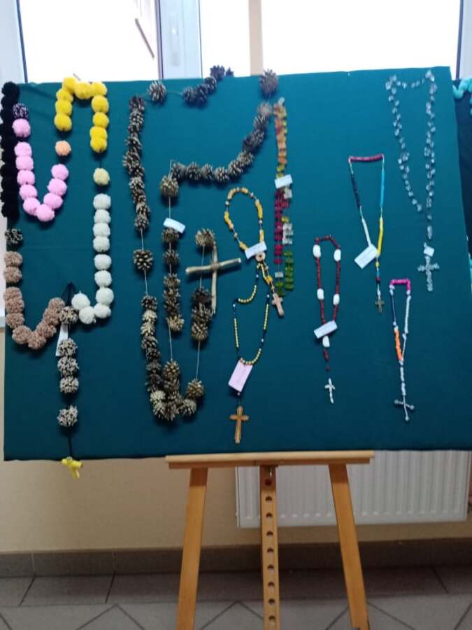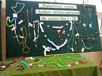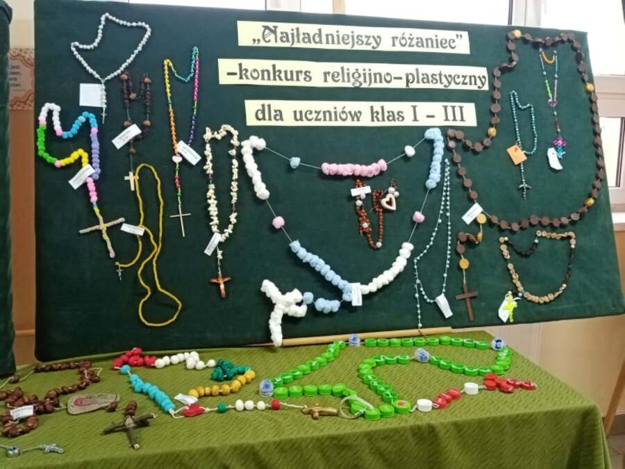 W październiku br. odbył się szkolny konkurs religijno-plastyczny „Najładniejszy różaniec”. W konkursie wzięli udział uczniowie klas I-III. Wykonali oni z pomocą rodziców piękne różańce, które zostały potem zaprezentowane na wystawie na szkolnym korytarzu.