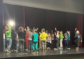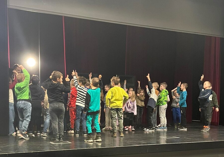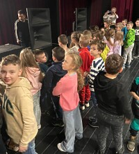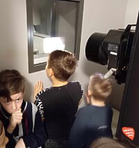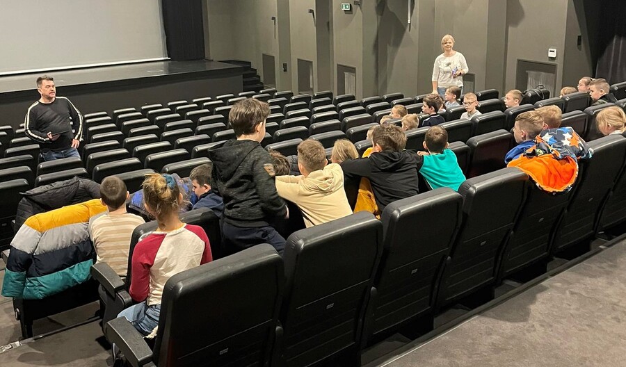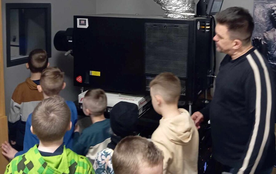 Pan Grzegorz kolejno zdradzał wszystkie kinowe tajniki: skąd dobiega głos, a skąd obraz, co skrywa się za ogromnym ekranem na scenie, na czym polega praca w kinie i wiele innych ciekawych informacji. Z całą pewnością uczniowie zapamiętają, że sercem kina jest projektornia, gdzie również zagościli.
