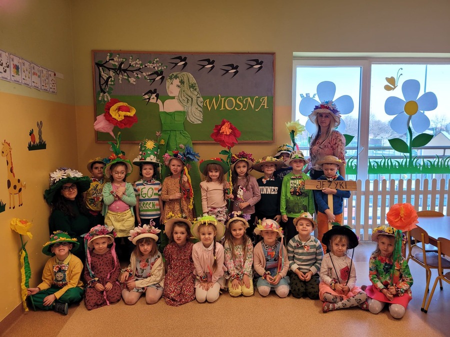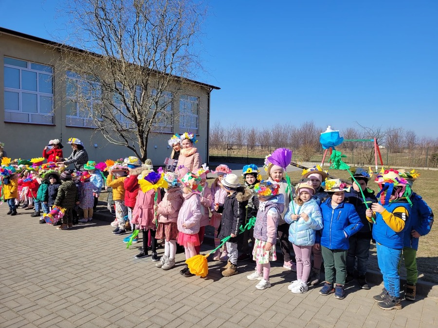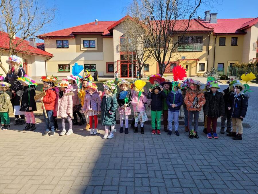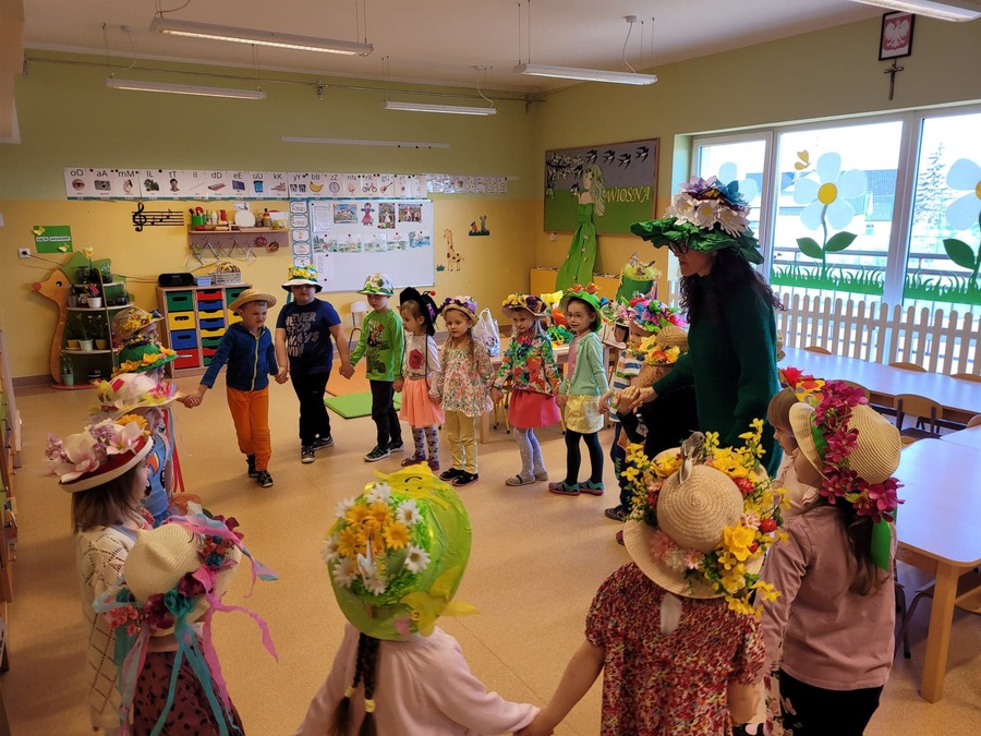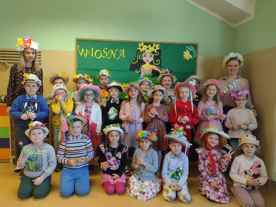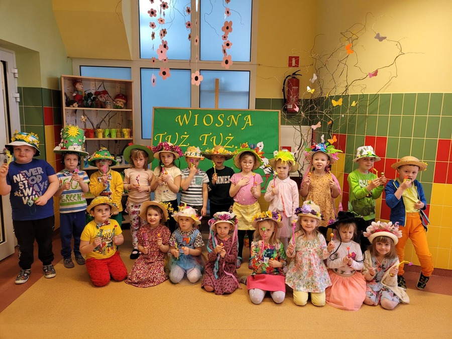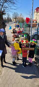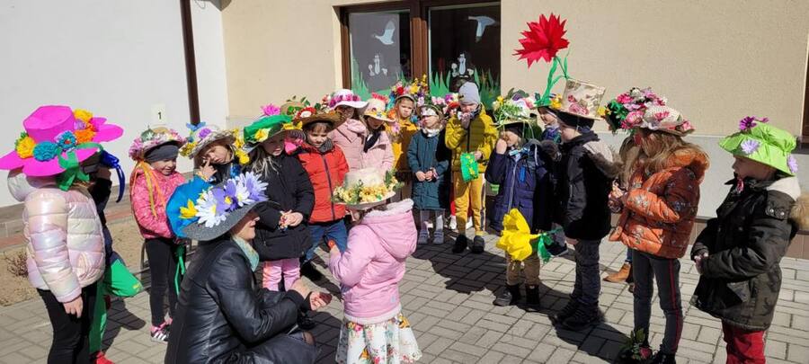 W naszym przedszkolu przygotowania do pożegnania zimy i powitania wiosny zaczęły się kilka dni wcześniej. Zmieniła się dekoracja przedszkola z zimowej na wiosenną. W salach zazieleniły się kąciki przyrody. Nie zabrakło również prac plastycznych, dotyczących pierwszych zwiastunów wiosny. Tego dnia w ubiorze przedszkolaków królowały wiosenne odcienie. Dzieci przyszły do przedszkola w „Wiosennych kapeluszach", które zostały przygotowane z pomocą rodziców lub dziadków. Każde dziecko prezentowało swój „Wiosenny kapelusz" przed grupą. Aby umilić ten piękny dzień Rada Rodziców podarowała dzieciom wiosenne niespodzianki, w postaci gumek do włosów dla dziewczynek i muszek dla chłopców z motywem kwiatowym, długopisów w kształcie kwiatka oraz słodkich lizaków.