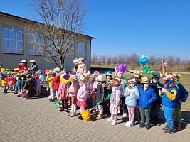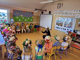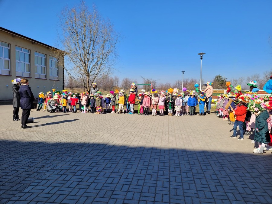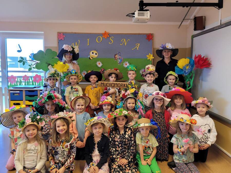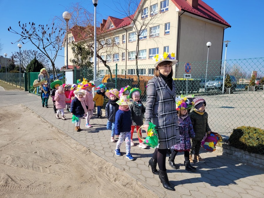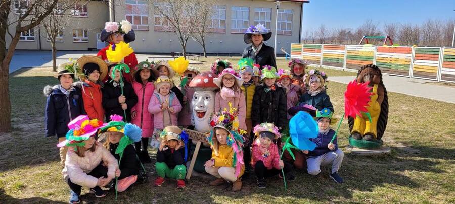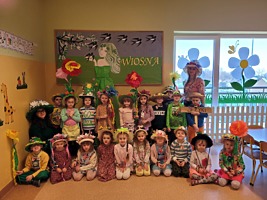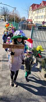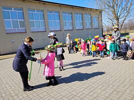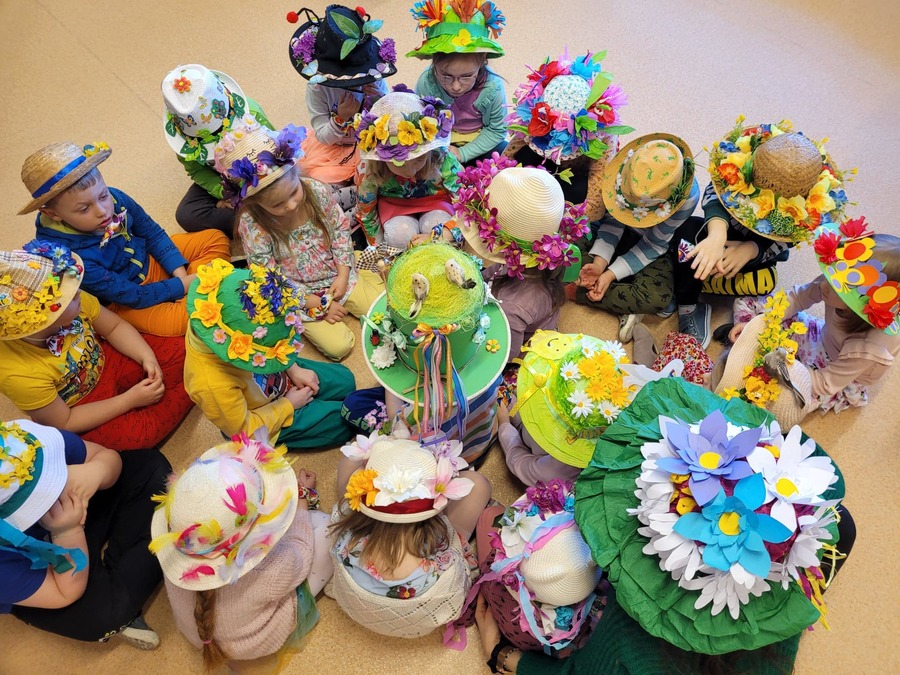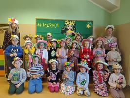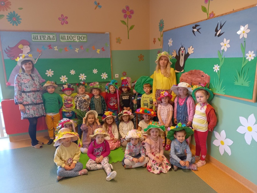 W naszym przedszkolu przygotowania do pożegnania zimy i powitania wiosny zaczęły się kilka dni wcześniej. Zmieniła się dekoracja przedszkola z zimowej na wiosenną. W salach zazieleniły się kąciki przyrody. Nie zabrakło również prac plastycznych, dotyczących pierwszych zwiastunów wiosny. Tego dnia w ubiorze przedszkolaków królowały wiosenne odcienie. Dzieci przyszły do przedszkola w „Wiosennych kapeluszach", które zostały przygotowane z pomocą rodziców lub dziadków. Każde dziecko prezentowało swój „Wiosenny kapelusz" przed grupą. Aby umilić ten piękny dzień Rada Rodziców podarowała dzieciom wiosenne niespodzianki, w postaci gumek do włosów dla dziewczynek i muszek dla chłopców z motywem kwiatowym, długopisów w kształcie kwiatka oraz słodkich lizaków.