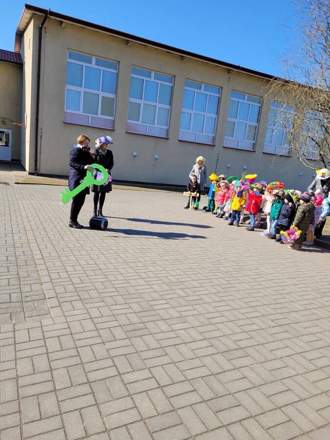 O godz. 10.00 wszystkie grupy przedszkolne wyruszyły na spotkanie z panią dyrektor Małgorzatą Hadzik, która magicznym kluczem otworzyła drzwi pani Wiośnie. Przedszkolaki z paniami przygotowały i zaprezentowały krótkie powitania przybyłej Wiośnie. Następnie wszyscy udali się na pierwszy wiosenny spacer.