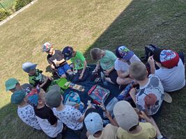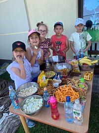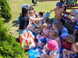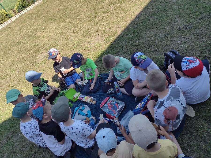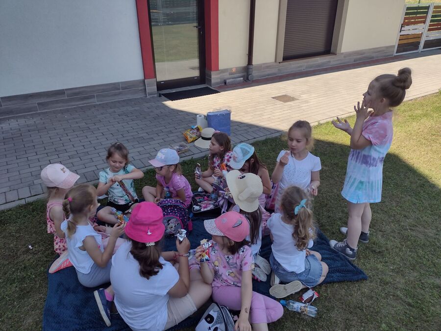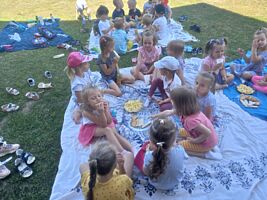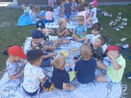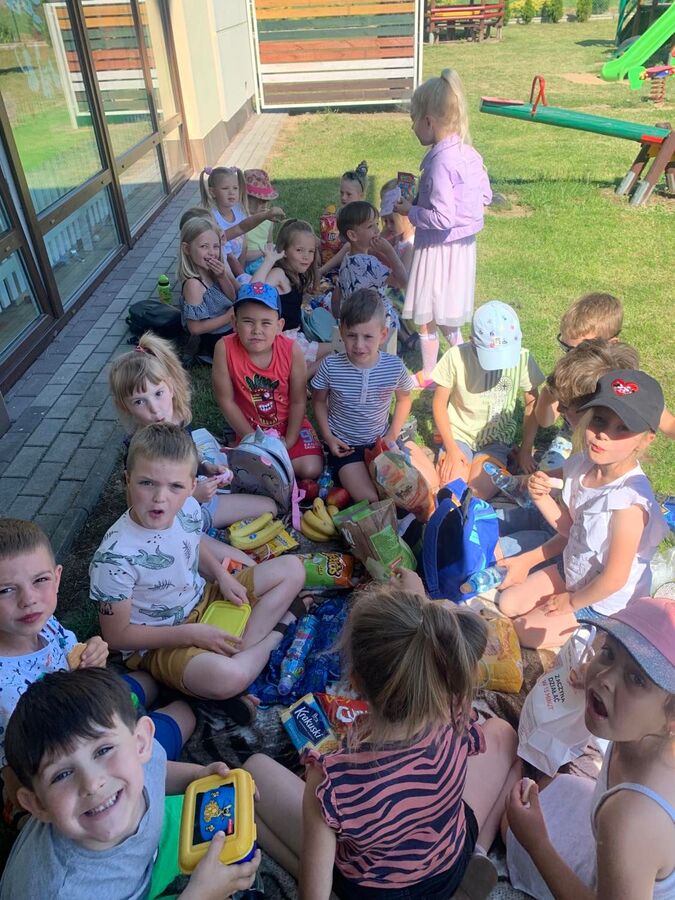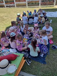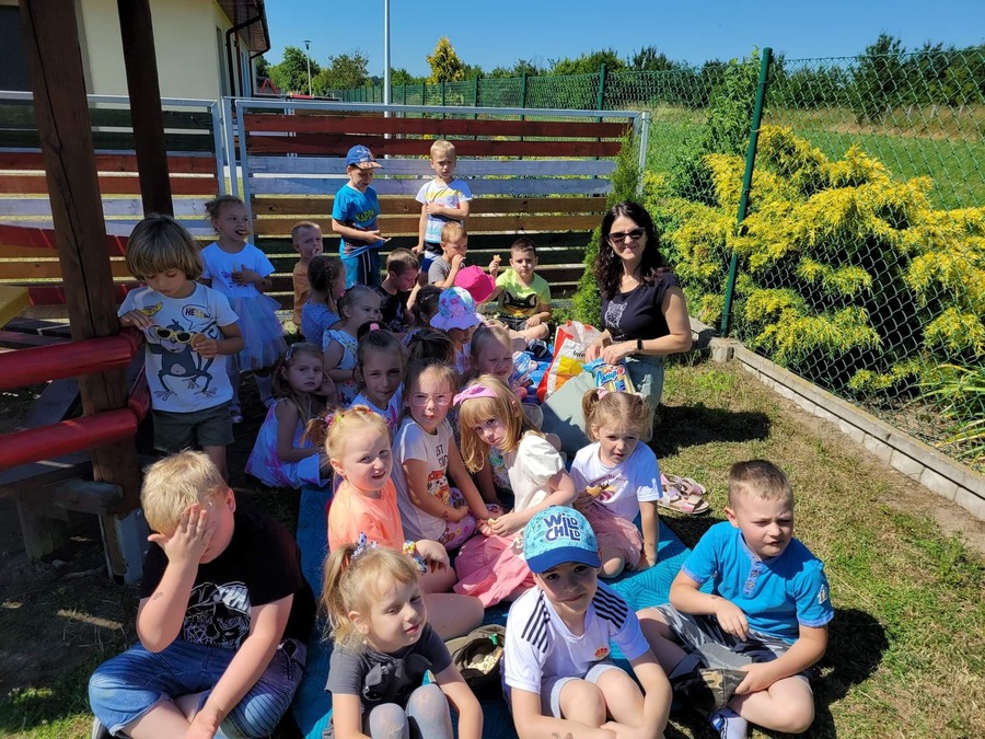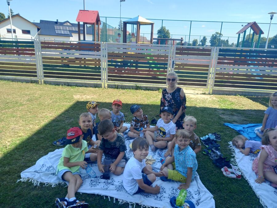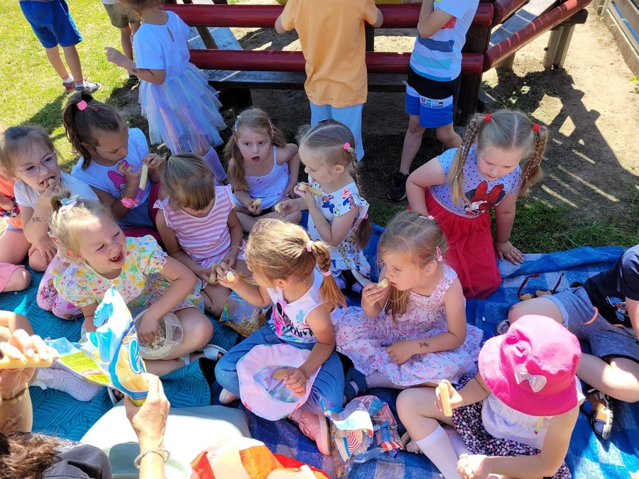 23 czerwca 2022r. przedszkolaki, korzystając z pięknej letniej pogody, zorganizowały na terenie placu zabaw piknik. Dzieci wspólnie spędziły czas na świeżym powietrzu. Były zabawy z koleżankami i kolegami z innych grup, wypoczynek na kocykach i delektowanie się łakociami.