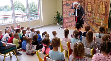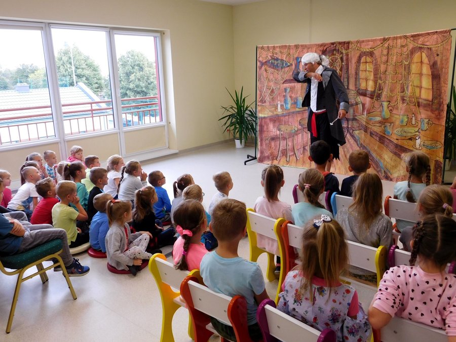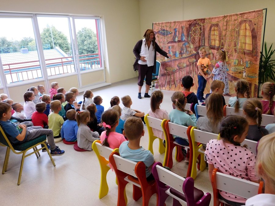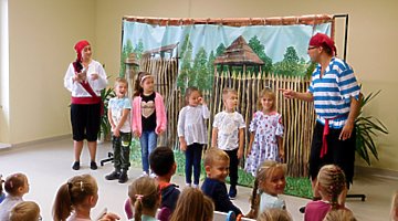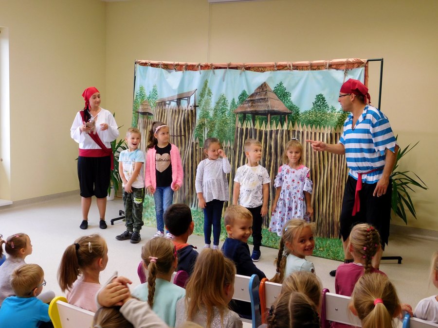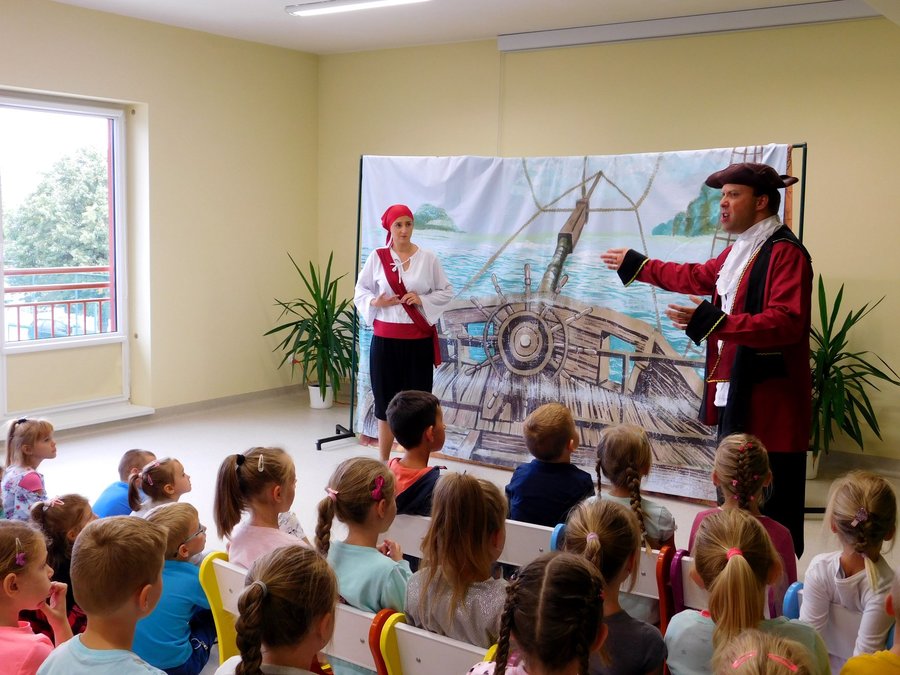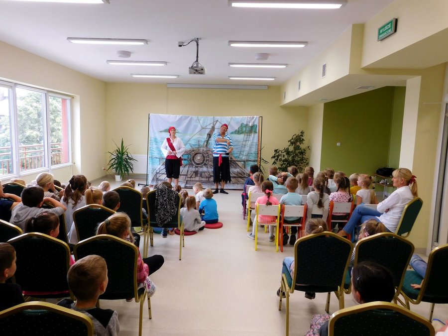 17 września 2019r. w Gminnej Bibliotece Publicznej w Trzcinicy uczniowie z klas I oraz przedszkolaki z najstarszych grup przedszkolnych miały okazję obejrzeć spektakl Teatru Blaszany Bębenek pt. „Piraci i wyspa skarbów”. Inspiracją do tego spektaklu była powieść Roberta Louisa Stevensona opowiadająca o losach piratów poszukujących ukrytego skarbu. Dzieci poznały bohatera spektaklu, młodą dziewczynę imieniem Gina. Seria wypadków sprawiła, że musiała ona wziąć udział w wyprawie po legendarny skarb kapitana piratów. Z pomocą małych widzów odkryła, że wśród załogi statku znajduje się dawny towarzysz kapitana piratów, który za wszelką cenę chce odzyskać łup. Po licznych przygodach, które wywoływały salwę śmiechu u dzieci, Ginie udało się pokonać podstępnego Kulawego Johna, który chciał zawłaszczyć sobie skarb i pomyślnie zakończyć wyprawę. Spektakl został wzbogacony o utwory zaśpiewane na żywo, zabawy ruchowe z dziećmi, oraz zmieniające się kurtyny imitujące różne przestrzenie. Oprócz fabuły bajki dzieci poznały zasady zachowania się w teatrze i stosowały się do nich w czasie przedstawienia.