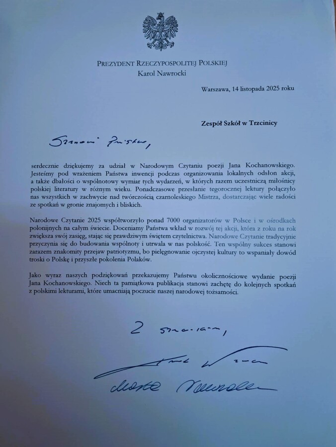 Miło nam poinformować, że nasza placówka otrzymała list od Prezydenta Rzeczypospolitej Polskiej Karola Nawrockiego, z podziękowaniem za udział w corocznej akcji Narodowego Czytania. Zespół Szkół w Trzcinicy znalazł się wśród 7000 tysięcy instytucji zaangażowanych w to ogólnopolskie wydarzenie czytelnicze.