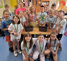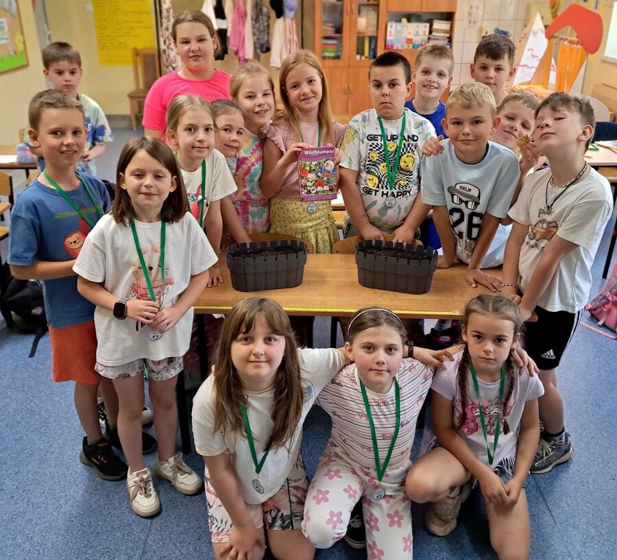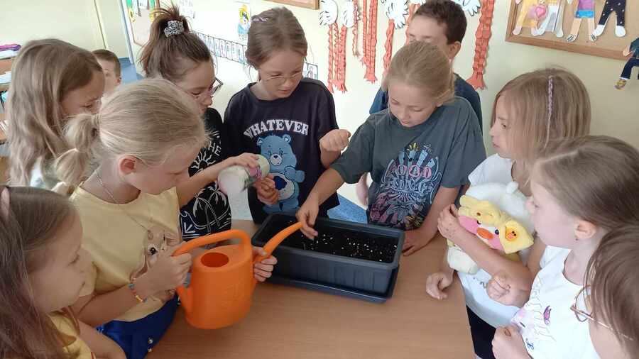 Klasy drugie całkiem niedawno prowadziły łąkowe obserwacje przyrodnicze. Pokłosiem tych plenerowych zajęć był pomysł parapetowej łąki w klasie. Dzieci wysiały mix łąkowych roślin do skrzynek. Teraz podlewają i obserwują nie mogąc się doczekać kwietnych efektów.