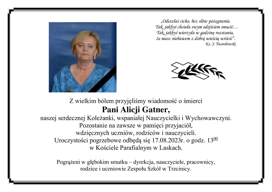 Z wielkim bólem przyjęliśmy wiadomość o śmierci Pani Alicji Gatner, naszej serdecznej Koleżanki, wspaniałej Nauczycielki i Wychowawczyni. Pozostanie na zawsze w pamięci przyjaciół, wdzięcznych uczniów, rodziców i nauczycieli. Uroczystości pogrzebowe odbędą się 17.08.2023r. o godz.13.00 w Kościele Parafialnym w Laskach.
