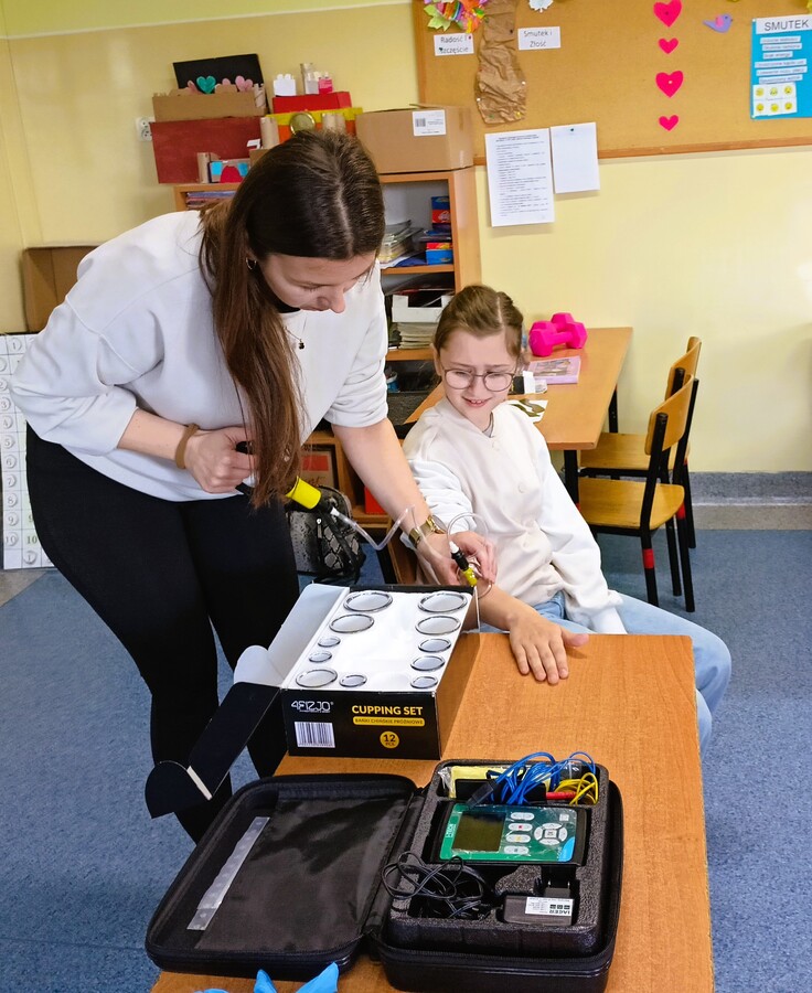 Uczniowie nie tylko dowiedzieli się na czym polega praca fizjoterapeutki, ale również mogli zapoznać się z narzędziami/przyrządami, którymi się posługuje.