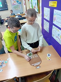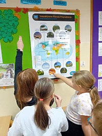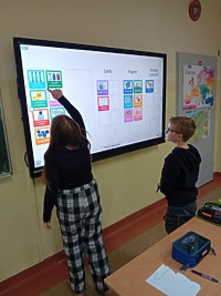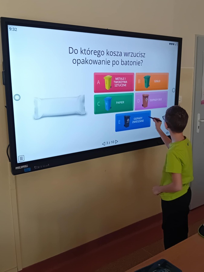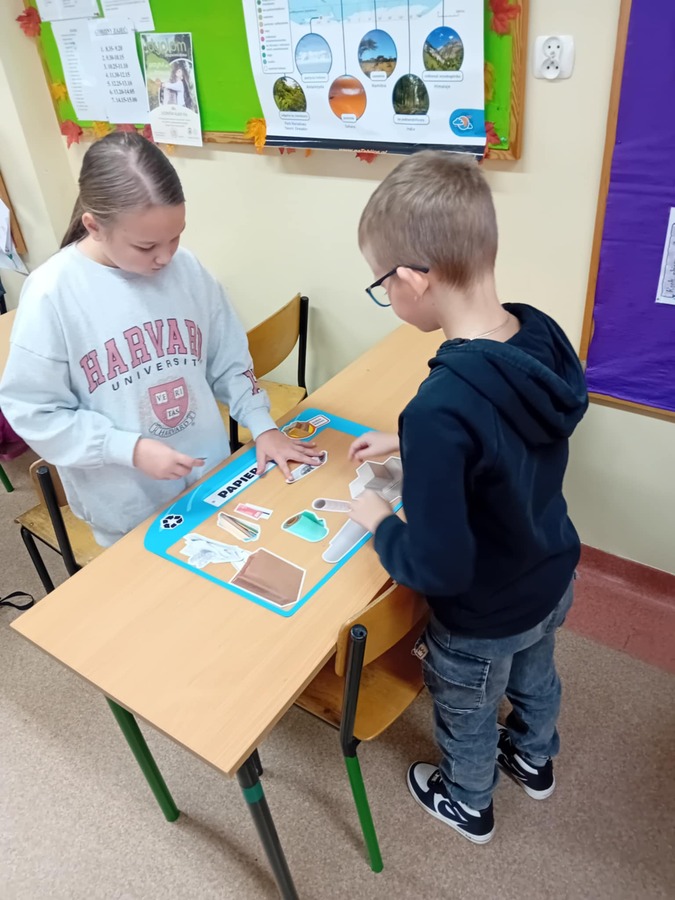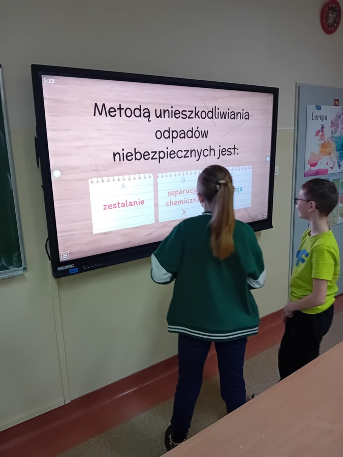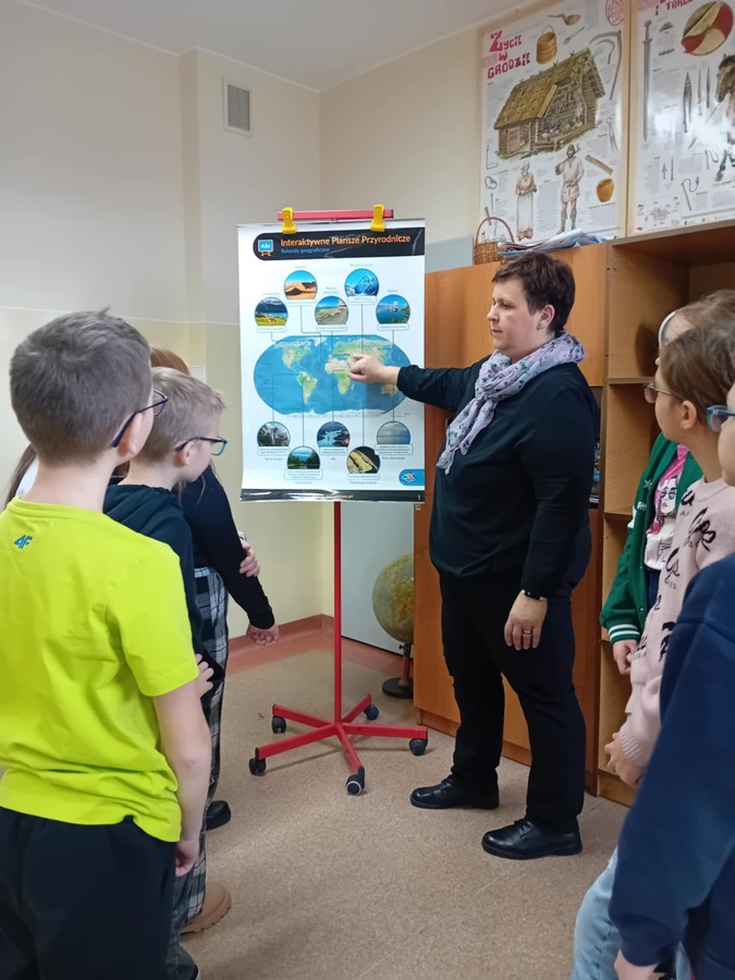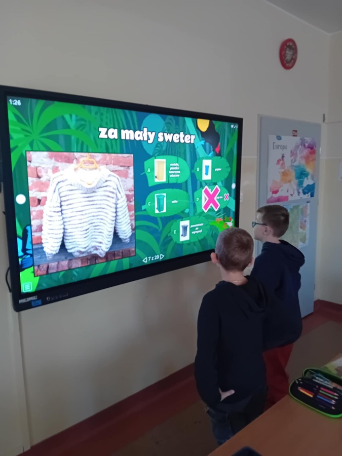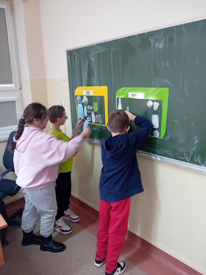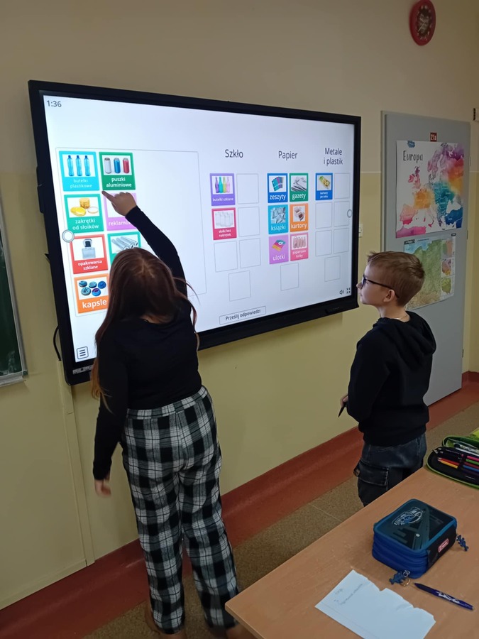 - Uczniowie kl. IVa 21. 11.2024 roku uczestniczyli w zajęciach podczas których w grupach tworzyli pojemniki i w nich umieszczali odpowiednie odpady. Rozmawiali również na temat odpadów niebezpiecznych. Grali również w gry i rozwiązywali quizy o tematyce ekologicznej. Na zajęciach przyrodniczych korzystali również z Interaktywnych plansz, które posłużyły do omówienia i pokazania piękna stref klimatycznych na świecie oraz przedstawienia uczniom światowych rekordów geograficznych i ich przyrodniczego piękna.