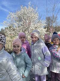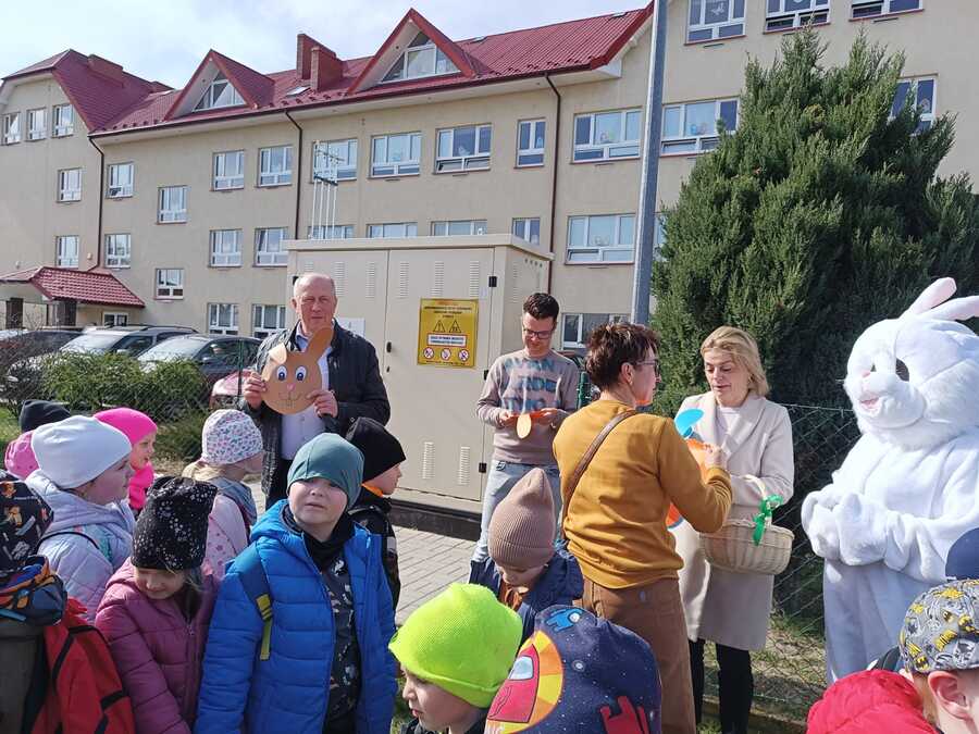 A pod przedszkolem niespodzianka. Na wszystkich czekał wójt gminy Trzcinica pan Grzegorz Hadzik z panią sekretarz Renatą Ciemny, a z nimi Zajączek. Oczekujący na przyjazd przedszkolaków goście obficie częstowali dzieci czekoladowymi jajeczkami.