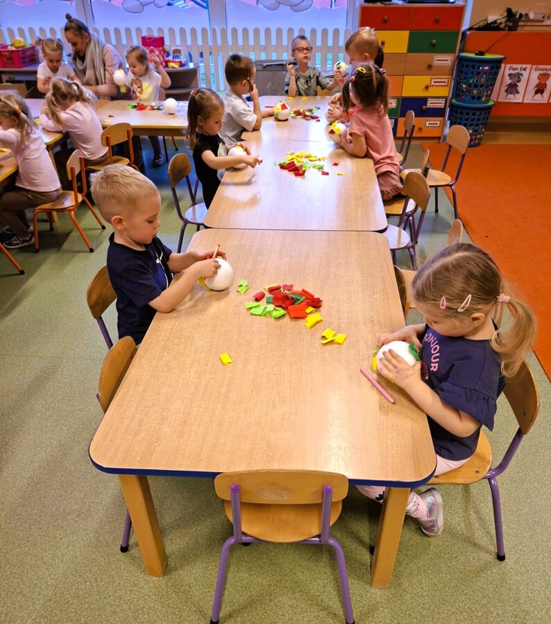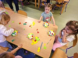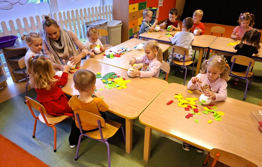 Zaangażowanie dzieci i wspólna praca przyniosła wspaniałe efekty. Powstałe piękne, kolorowe bombki dzieci zabrały ze sobą do domów aby tam przyozdobiły choinki.