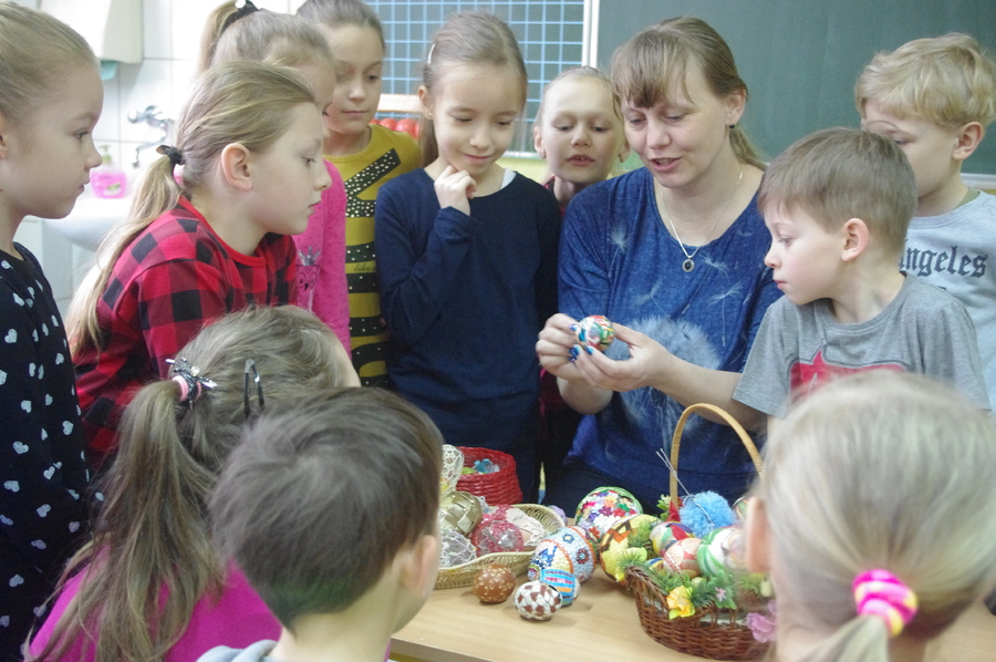 Klasa IIa szkoły podstawowej gościła panią Karolinę Więcek (mamę jednej z uczennic), która przedstawiła uczniom sposoby wykonywania pisanek wielkanocnych i innych ozdób świątecznych. Dzieci z ciekawością słuchały pogadanki i z dużym zaangażowaniem uczestniczyły w tych zajęciach.