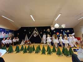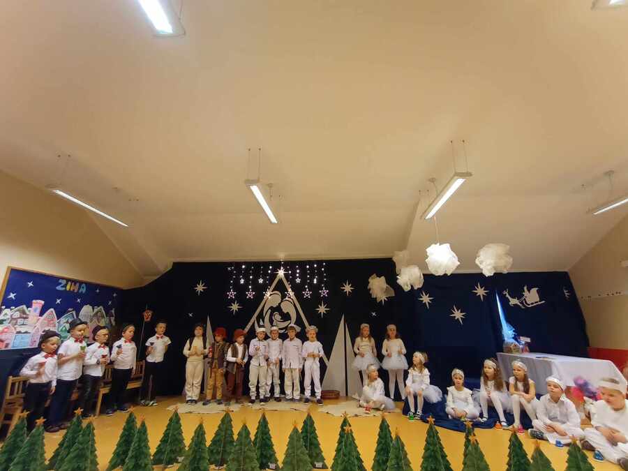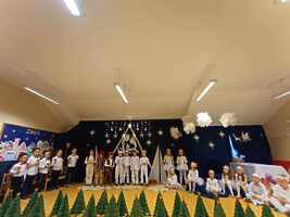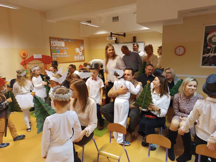 Starsze grupy „Muchomorki” i „Smoki Dinusie” do swoich sal zaprosiły rodziców 19 grudnia 2023r. a młodsze grupy „Krasnoludki” i „Jeżyki” 20 grudnia 2023r. Dzieci występując przed swoimi rodzicami miały okazję prezentacji zdobytych do tej pory w przedszkolu umiejętności. Współpraca z rodzicami zaowocowała pięknymi strojami, uzupełniając te przedszkolne. Współdziałanie wszystkich odniosło sukces w postaci różnorodnych, ale jakże pięknie, przygotowanych występów wszystkich przedszkolaków. W tych świątecznych spotkaniach uczestniczyła również dyrektor Zespołu Szkół Pani Ewa Hetmańczyk, która dzieciom i rodzicom złożyła świąteczne życzenia.