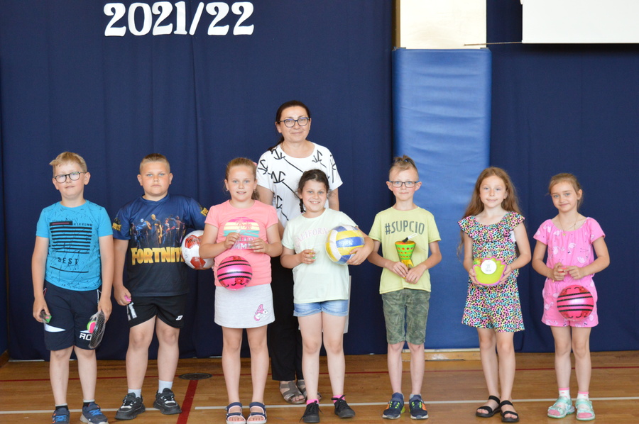 Opiekunka Szkolnej Kasy Oszczędności nagrodziła uczniów, którzy w minionym roku szkolnym dokonali największej liczby wpłat na swoje konto. Otrzymali oni piłki i zabawki rekreacyjne zakupione z funduszu SKO.