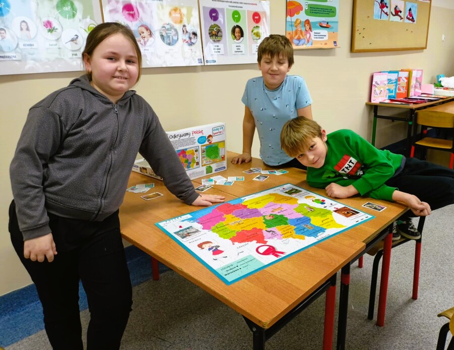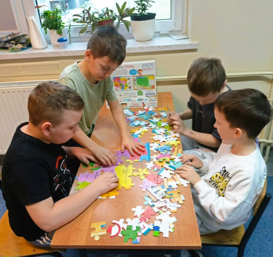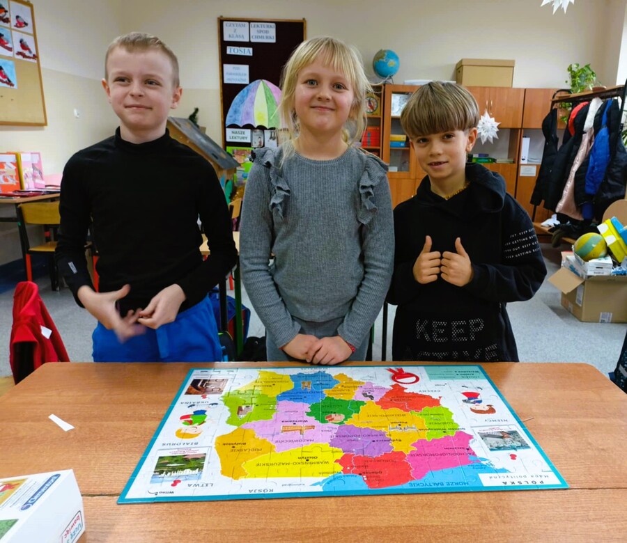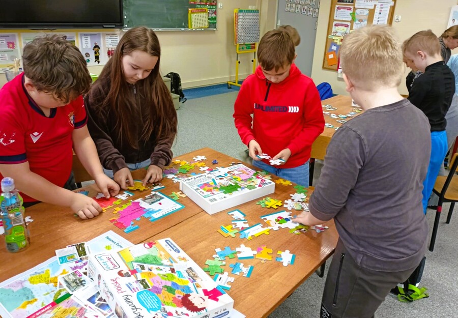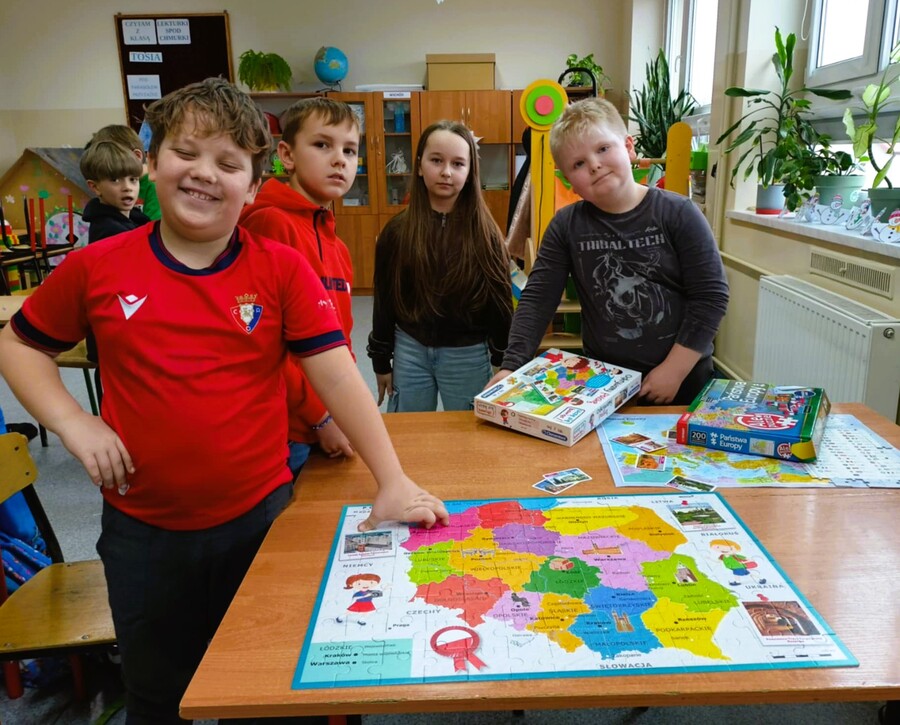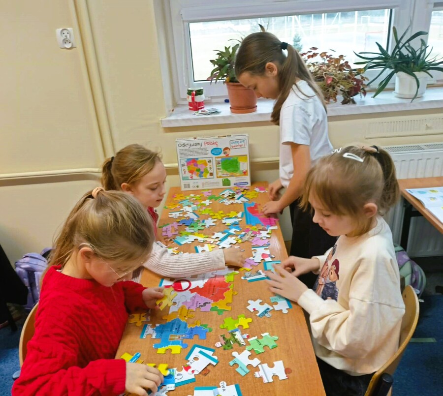 Odbyły się nawet klasowe turnieje układania puzzli. Dzieci w drużynach układały jednakowe zestawy przedstawiające mapę Polski. Zajęcia sprzyjały nauce współpracy, a towarzyszyło im mnóstwo zdrowej rywalizacji, dobrej energii i śmiechu.