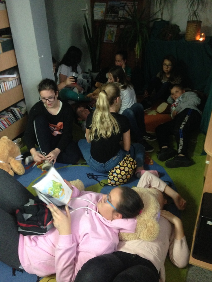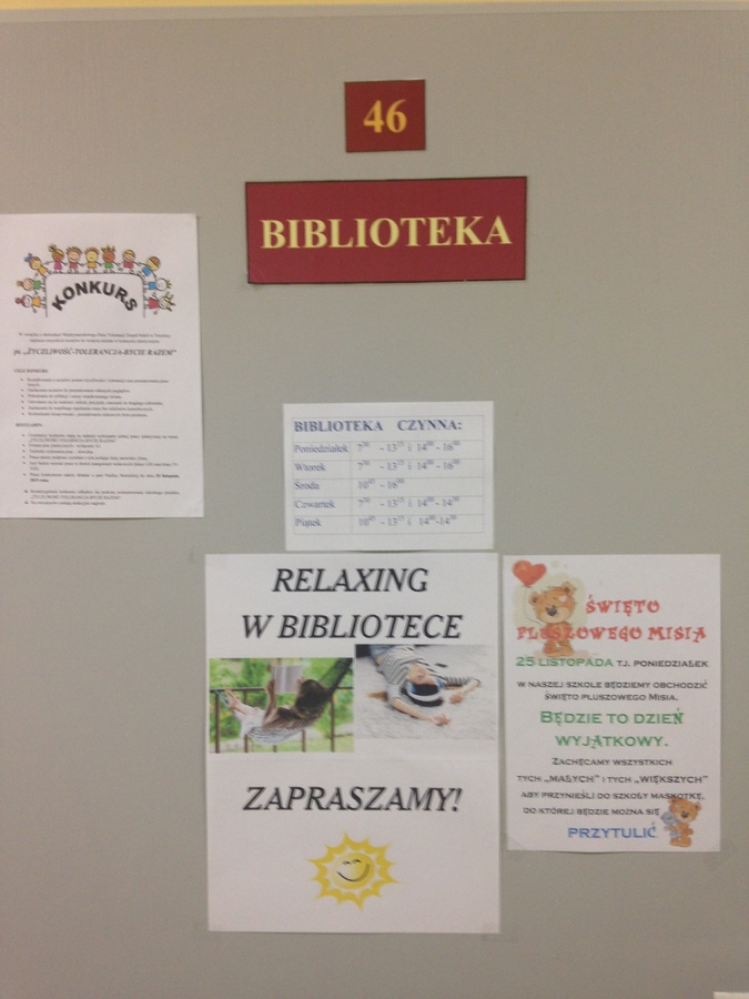 Biblioteka szkolna włączyła się w realizację szkolnego projektu „Życzliwość-tolerancja-bycie razem” i przygotowała ciekawe propozycje dla uczniów. Jedną z nich był „Relaksing w bibliotece”. W dniach 25-28 listopada w czasie przerw śródlekcyjnych uczniowie mogli przyjść do biblioteki i w specjalnie przygotowanej strefie relaksu wyciszyć umysł i serce. Mogli poleżeć na dywanie, poczytać książkę, odpocząć słuchając muzyki relaksacyjnej. Z tej oferty biblioteki skorzystało wielu uczniów.
