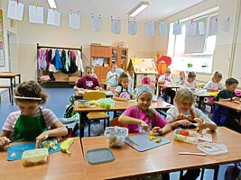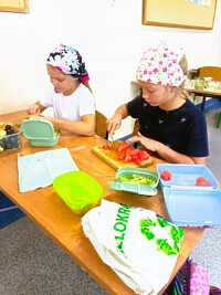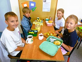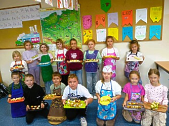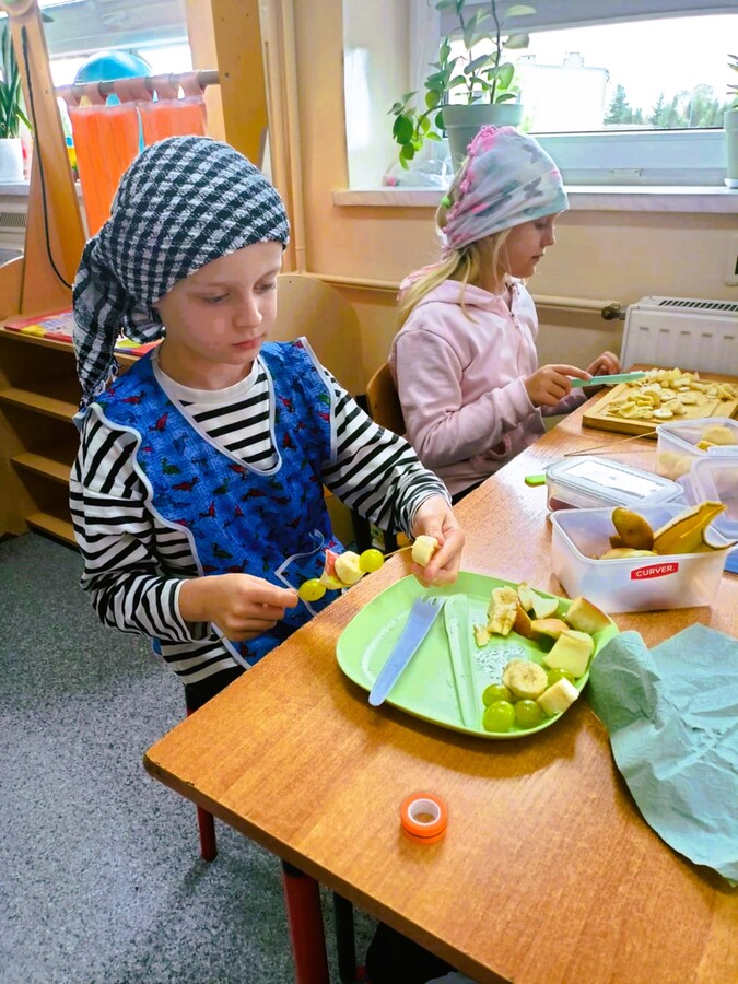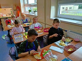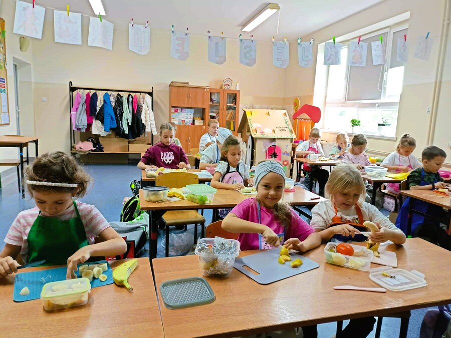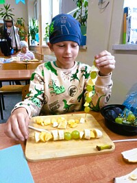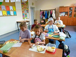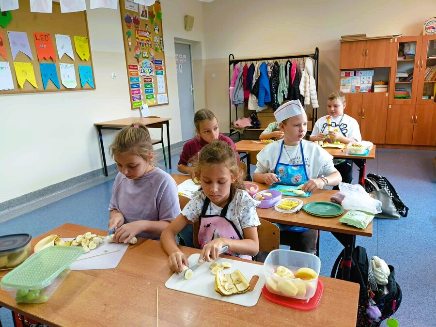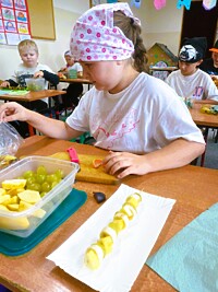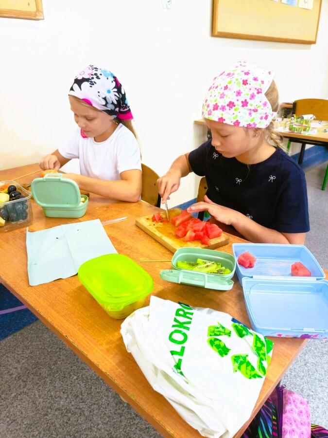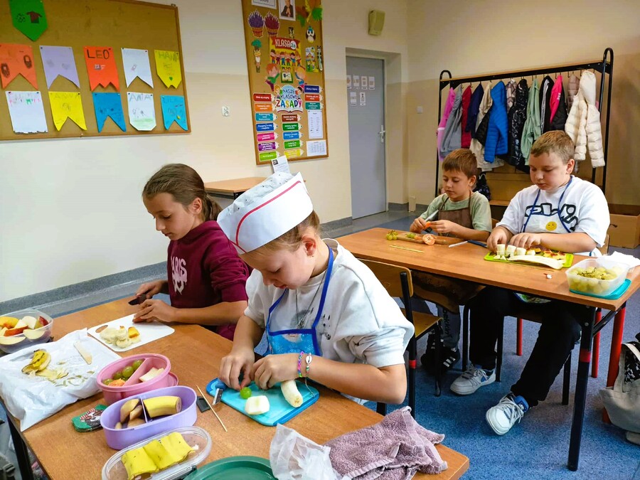 Ostatnie dni września uczniowie klas drugich spędzili rozmawiając o zdrowym trybie życia. Przypomnieli sobie piramidę zdrowego odżywiania i aktywności fizycznej. Układali jadłospisy z wartościowych produktów, które mogli wykonać w domach. Podsumowaniem tej tematyki było przygotowanie zdrowego dodatku do drugiego śniadania spożywanego w szkole. Dzieci przyniosły z domów swoje ulubione owoce, deseczki, nożyki i nakrycia głowy, by w klasach przygotować owocowe szaszłyki.