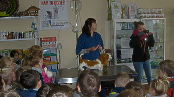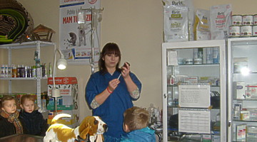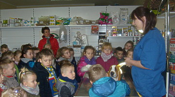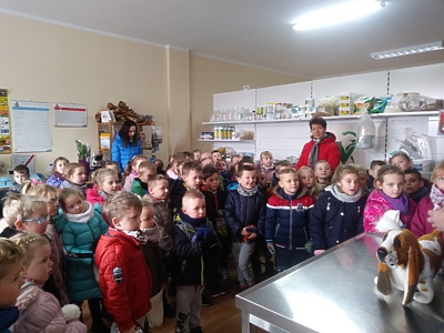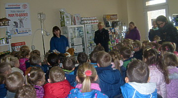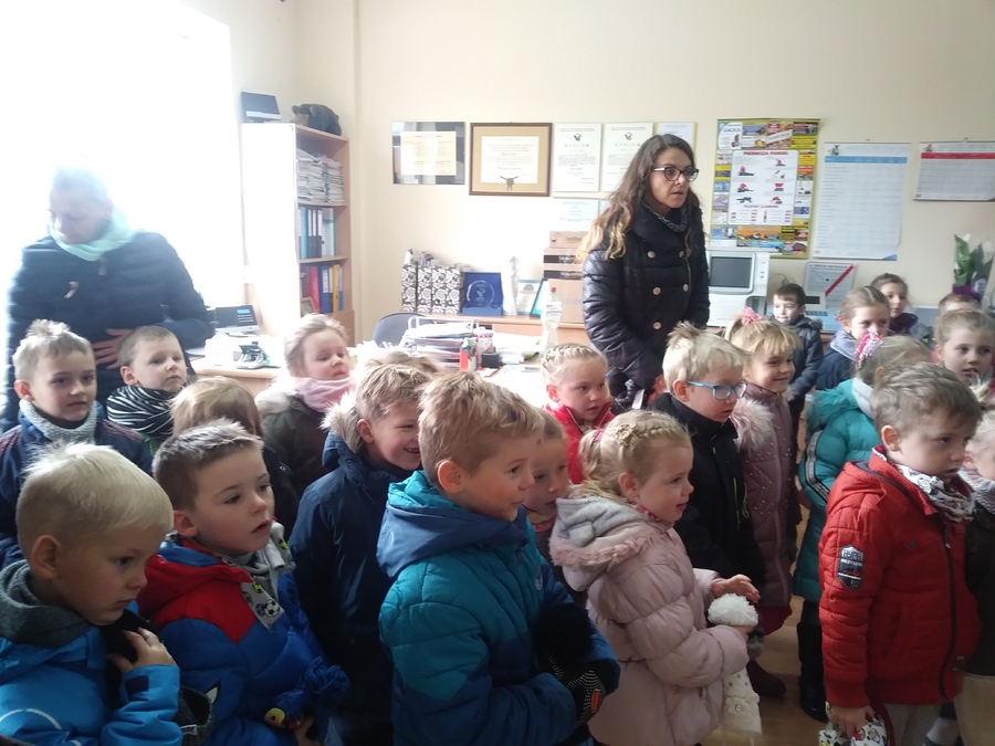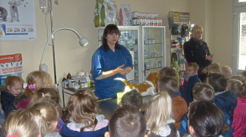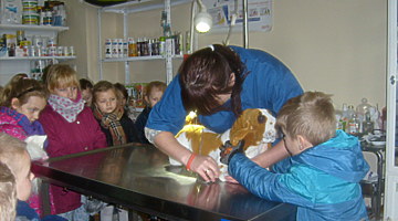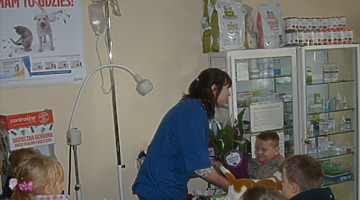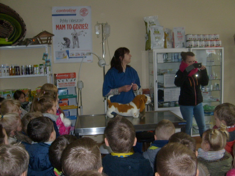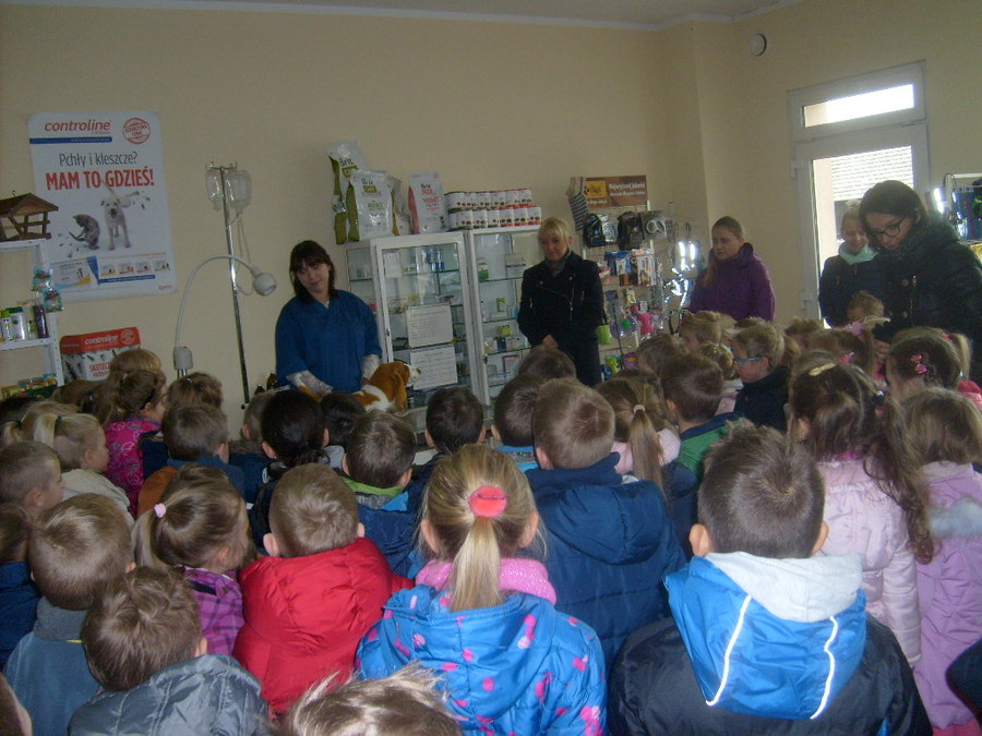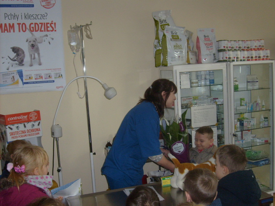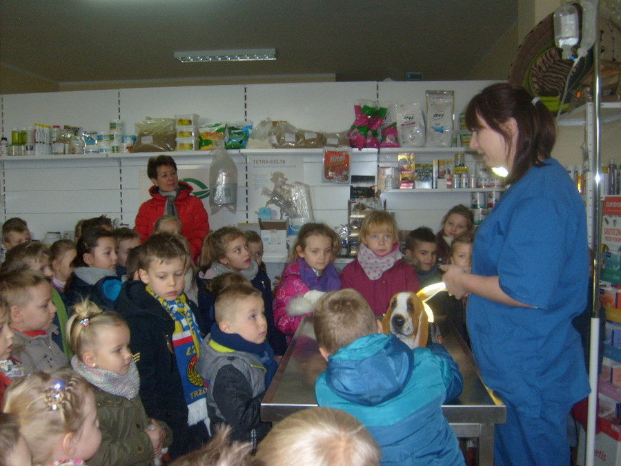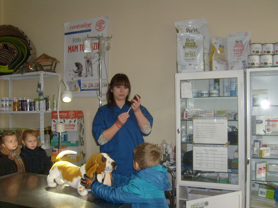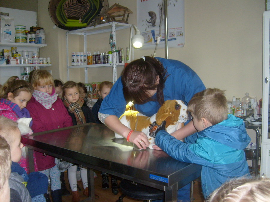 Trzy najstarsze grupy przedszkolaków tzn. „Muchomorki”, „Jeżyki” i „Smoki Dinusie” odwiedziły gabinet weterynaryjny VetMedic w Trzcinicy. Powodem wizyty była „choroba” psa Burka (jednej z pluszowych zabawek). Przedszkolacy byli świadkami jak pani Agata Maryniak – weterynarz, diagnozowała i przeprowadzała leczenie chorego pieska. Dzieci z uwagą obserwowały mierzenie temperatury, podawanie zastrzyku, tabletek i podłączenie kroplówki choremu zwierzakowi. Pani Agata zaproponowała dodatkowo kąpiel i strzyżenie pieska, gdyż wykonuje jeszcze drugi zawód – groomer (strzyże i pielęgnuje psy). Wszystkie zabiegi przyniosły oczekiwany efekt – Burek wyzdrowiał. Dzieci zabrały go z powrotem do przedszkola i obiecały, że przez najbliższe dni będą troskliwie opiekować się pieskiem.