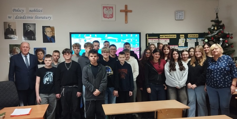 W czwartek 15 stycznia 2026r. w ramach lekcji wiedzy o społeczeństwie w klasie VIII odbyło się spotkanie z Panem Grzegorzem Hadzikiem, Wójtem Gminy Trzcinica. Podczas lekcji uczniowie dowiedzieli się, kto sprawuje władzę uchwałodawczą i wykonawczą w Gminie. Wójt omówił zadania własne i zlecone Gminy. Wyjaśnił również, skąd Gmina czerpie fundusze na realizację swoich zadań, tłumacząc przy tym, jaka jest różnica między dotacją a subwencją. Lekcja ta była doskonałym powtórzeniem i podsumowaniem rozdziału - Społeczność lokalna i regionalna.