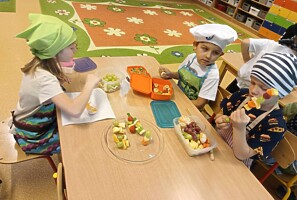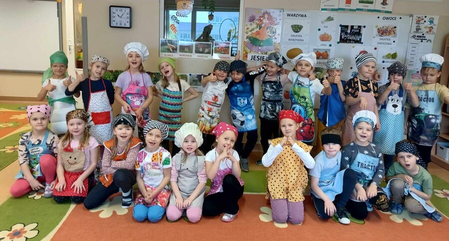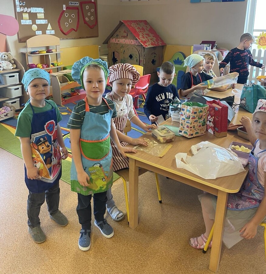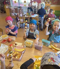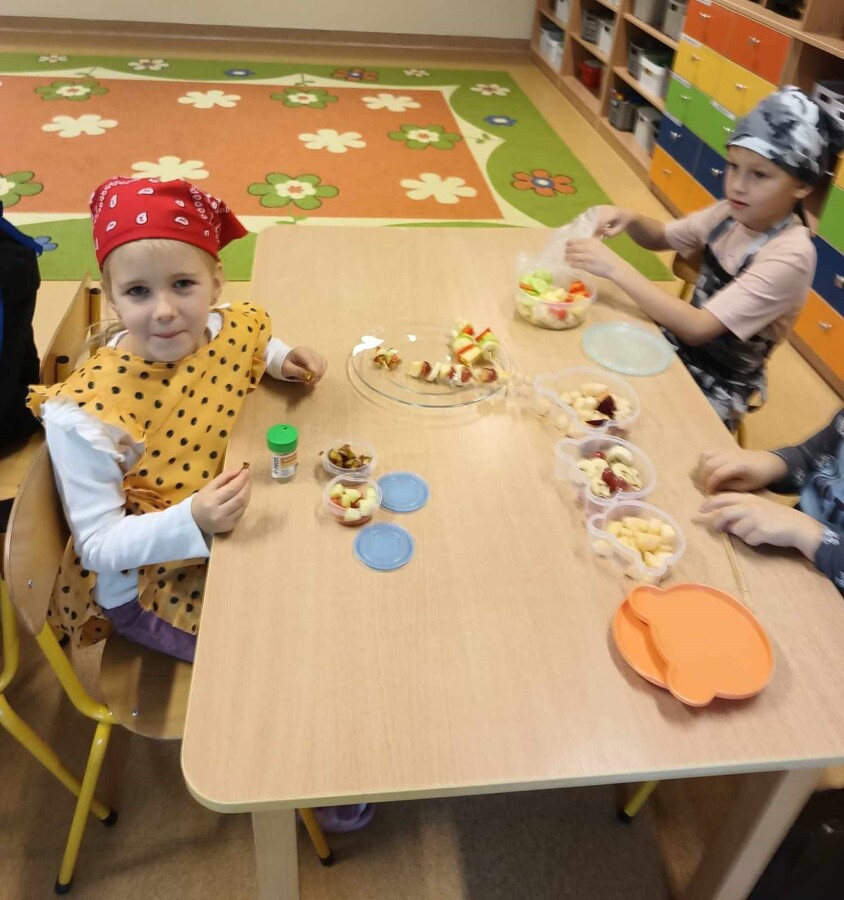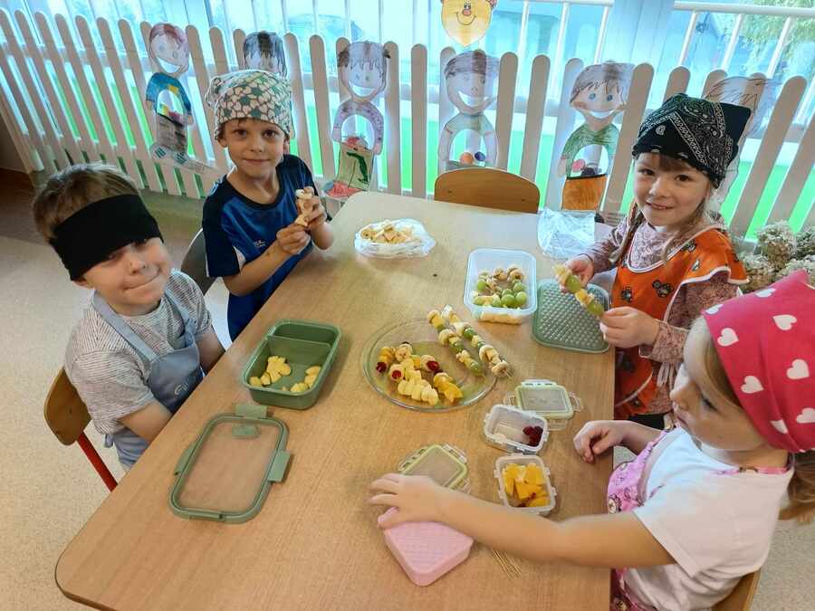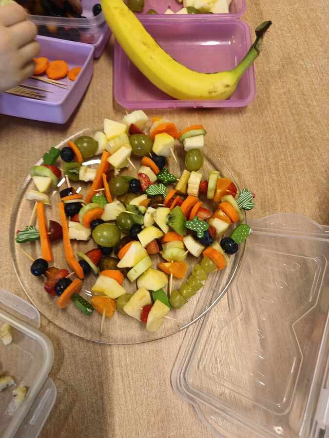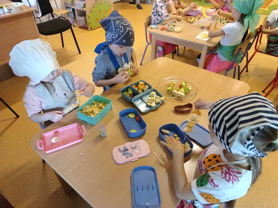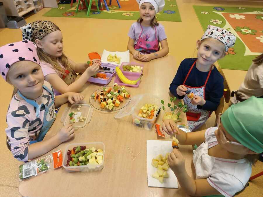 W tym tygodniu starsze grupy przedszkolne – Smoki Dinusie i Muchomorki zakończyły omawianie tematyki związanej z warzywami i owocami. Była to dobra okazja do przygotowania witaminowego przyjęcia. Dzieci ochoczo przystąpiły do wykonania zdrowych przekąsek. Z zaangażowaniem pracowały nad owocowo – warzywnymi koreczkami, szaszłykami i sałatką. Wyniki kuchennych eksperymentów przedszkolaków były naprawdę zadziwiające. Stoły przyozdobione barwnymi talerzami, pełnymi witaminowych smakołyków robiły niezwykłe wrażenie. Nie trzeba było więc długo czekać by dzieci zaczęły kosztować i częstować się przygotowanymi przez siebie pysznościami.