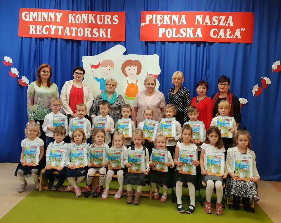 Dnia 28 listopada 2018r. w Zespole Szkół im. Jana Pawła II w Laskach odbył się Gminny Konkurs Recytatorski pod hasłem „Piękna nasza Polska cała” dla dzieci przedszkolnych. Dzieci z przedszkola wspólnie ze swoimi wychowawczyniami wybrały wiersze, których przez kilka dni uczyły się. Ta dodatkowa praca przyniosła następujące efekty: