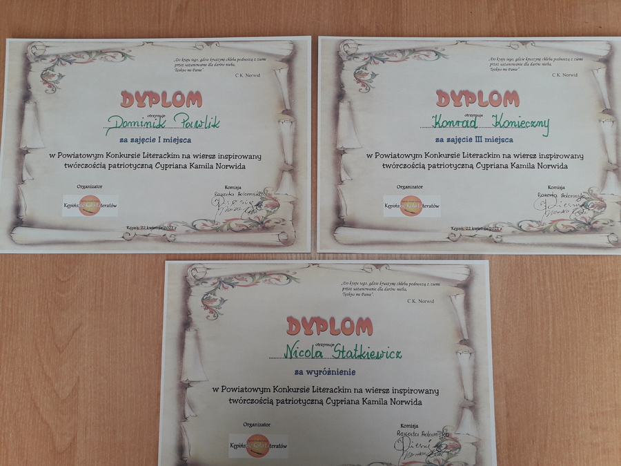 Kępińskie Koło Literatów zorganizowało w kwietniu br. „KONKURS LITERACKI NA WIERSZ INSPIROWANY TWÓRCZOŚCIĄ PATRIOTYCZNĄ CYPRIANA KAMILA NORWIDA”. Konkurs miał zasięg powiatowy i mogli w nim wziąć udział uczniowie klas VII i VIII.