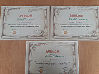 Sukces w tym konkursie odnieśli uczniowie naszej szkoły: Dominik Pawlik, Konrad Konieczny i Nicola Statkiewicz. Dominik zajął I miejsce, Konrad zajął III miejsce, a Nicola zdobyła wyróżnienie.