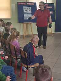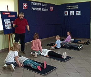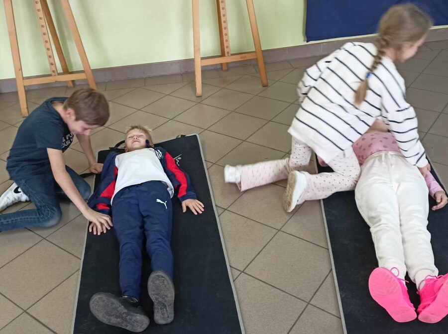 Podczas spotkania uczniowie przypomnieli sobie najważniejsze informacje dotyczące numerów alarmowych, oraz jak reagować na trudne sytuacje, z którymi możemy się spotkać. Dzieci uczyły się również sprowadzenia poszkodowanego do pozycji bocznej ustalonej, czyli pozycji bezpiecznej.