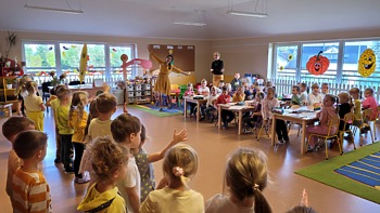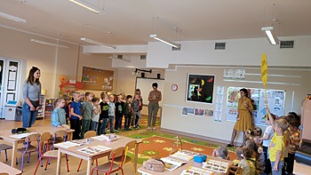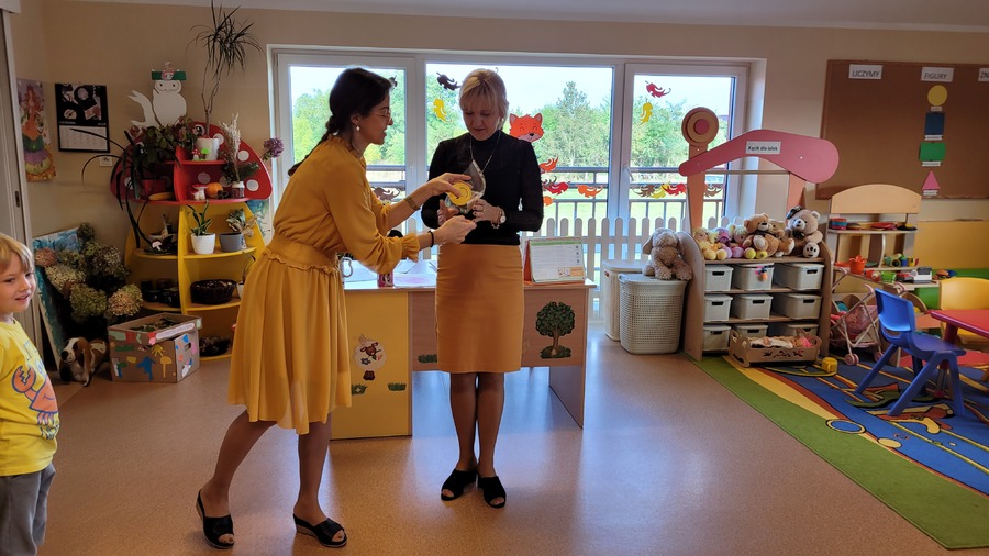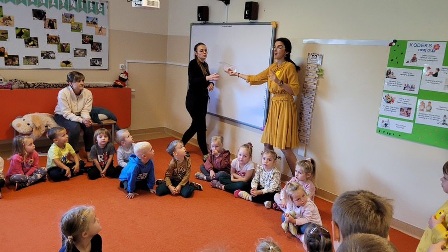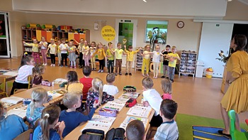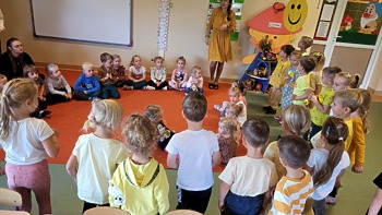 Dzieci odwiedzając inne grupy chętnie dzieliły się uśmiechem, tańczyły, śpiewały pełną radości powitankę.