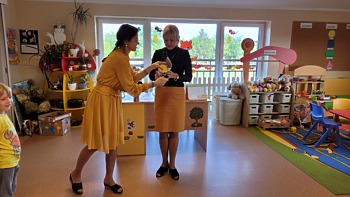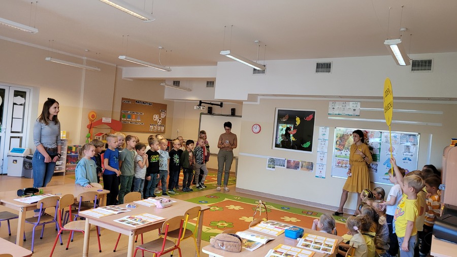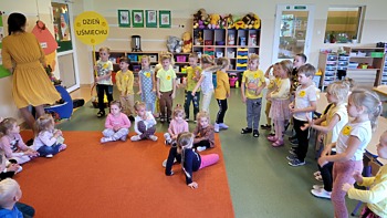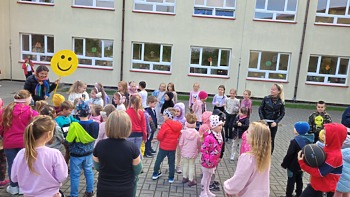 Bardzo ważnym i wesołym akcentem był spacer z transparentem informującym przechodniów o tym niezwykłym dniu, podczas którego dzieci rozdawały wszystkim uśmiechy, słały dobre życzenia i obdarowywały napotkane osoby naklejkami z uśmiechniętą buzią.