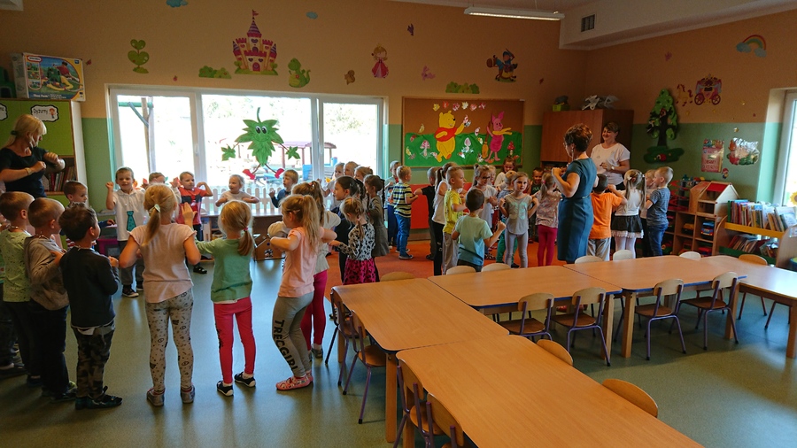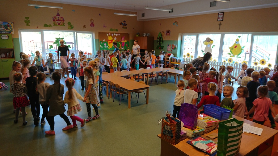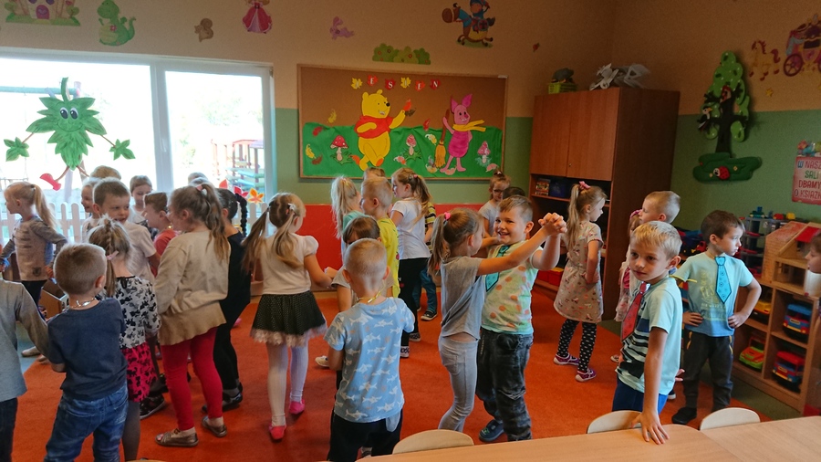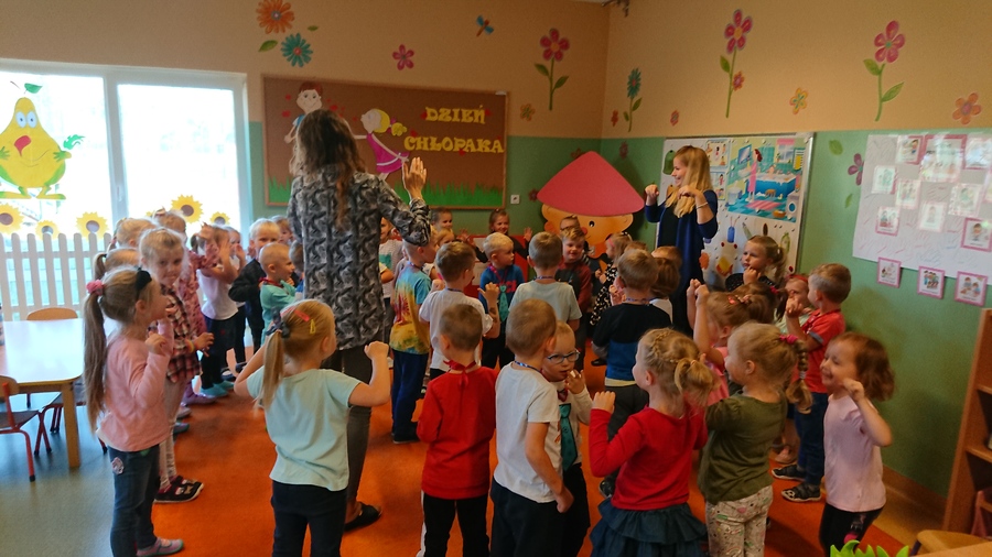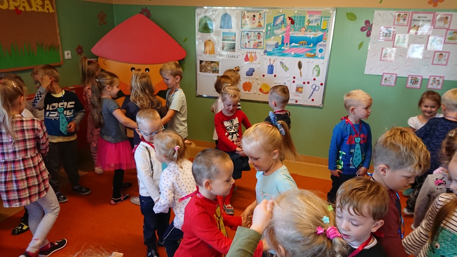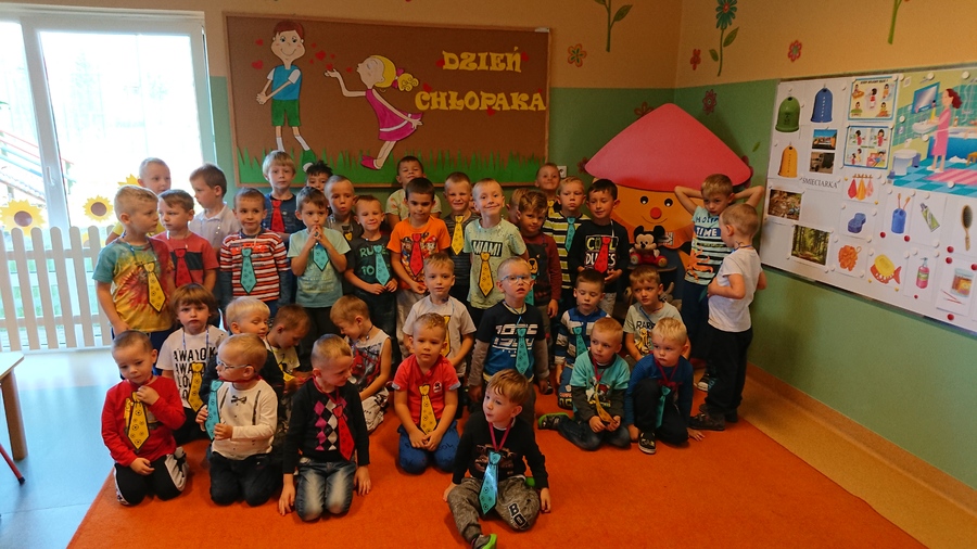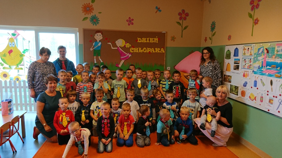 Już w piątek 28 września 2018r. wszyscy chłopcy z przedszkola świętowali Dzień Chłopca. Na uroczystość dzieci wraz ze swoimi Paniami zaprosiły pana woźnego Piotra Papióra. Dziewczynki podarowały wszystkim kolegom piękne krawaty. Starsi chłopcy – pan Krzysiu i pan Piotr również otrzymali „niezbędnik każdego eleganta” i usłyszeli piękne życzenia. Roześmiane przedszkolaki cieszyły się i tańczyły przy rytmach samby i kaczuszek, a w przerwach częstowały się cukierkami zakupionymi przez Radę Rodziców Przedszkola.