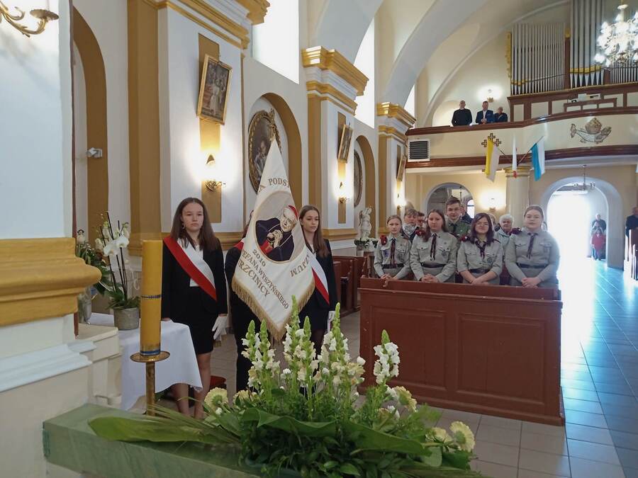 3 maja 2023r. poczet sztandarowy, delegacja uczniów i nauczycieli Zespołu Szkół w Trzcinicy wzięli udział w gminnych obchodach Święta Konstytucji. Przedstawiciele naszej szkolnej społeczności uczestniczyli w mszy św. odprawionej w intencji Ojczyzny, a następnie wzięli udział w uroczystości gminnej, podczas której złożyli kwiaty pod tablicą pamiątkową.