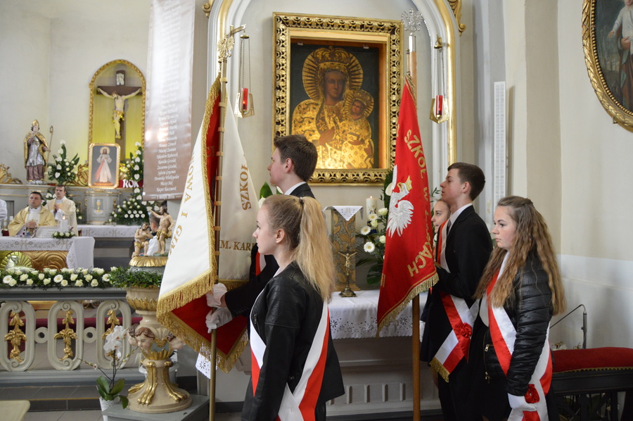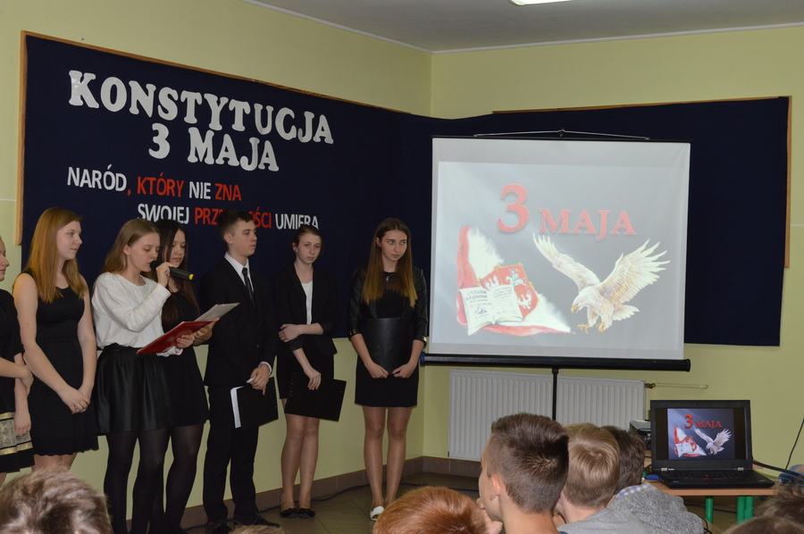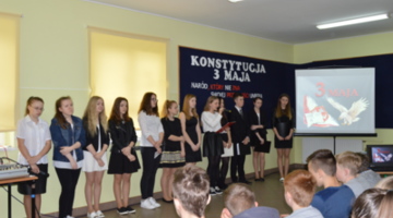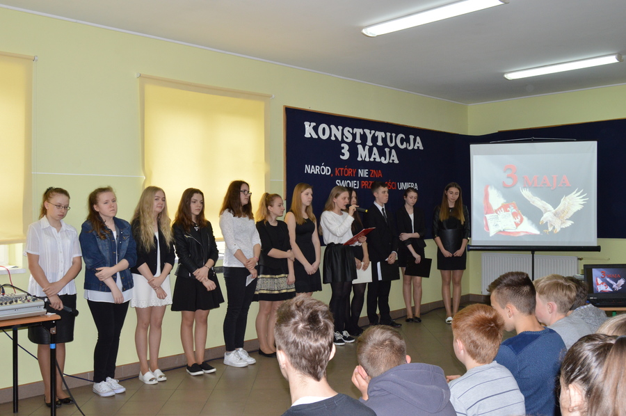 04 maja 2016r. w ramach szkolnych obchodów Święta 3 Maja odbyły się uroczyste apele w dwóch grupach wiekowych (klasy III-V szkoły podstawowej, klasy VI szkoły podstawowej i I-III gimnazjum). Uczniowie w skupieniu wysłuchali części artystycznej przygotowanej przez gimnazjalistów. Myślą przewodnią spotkania były słowa „Naród, który nie zna swojej przeszłości umiera”. Młodzież przekonywała, że nie można budować przyszłości nie znając swojej przeszłości, swojej historii.