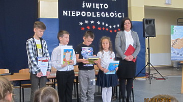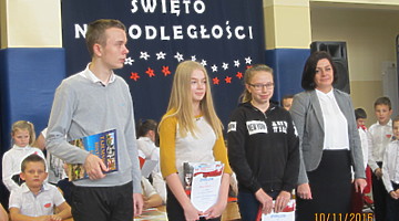 Obecna podczas szkolnych uroczystości sekretarz Gminy Trzcinica pani Renata Ciemny ogłosiła wyniki konkursów, które z okazji Święta Niepodległości ogłosił wójt Gminy Trzcinica, i wręczyła uczniom dyplomy i nagrody.