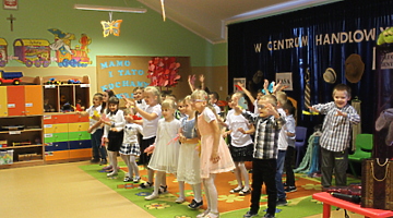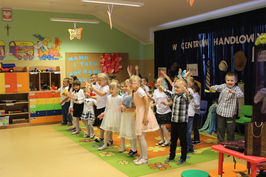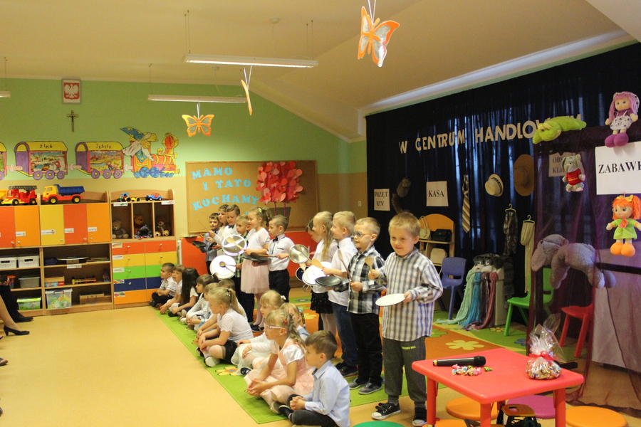 Pierwszego dnia mamusie i tatusiowie z grup przedszkolnych „Smoki Dinusie” i „Muchomorki” obejrzeli humorystyczne przestawienie na temat rodzinnych zakupów w „Centrum Handlowym”, w czasie których można zapodziać gdzieś synusia czy córeczkę. Na szczęście zakupy się udały, a rodzice z dziećmi, choć nieco zmęczeni, wrócili do domu. Śmieszne dialogi przeplatane były piosenkami i tańcami, w których wykorzystywano nawet łyżki i pokrywki.