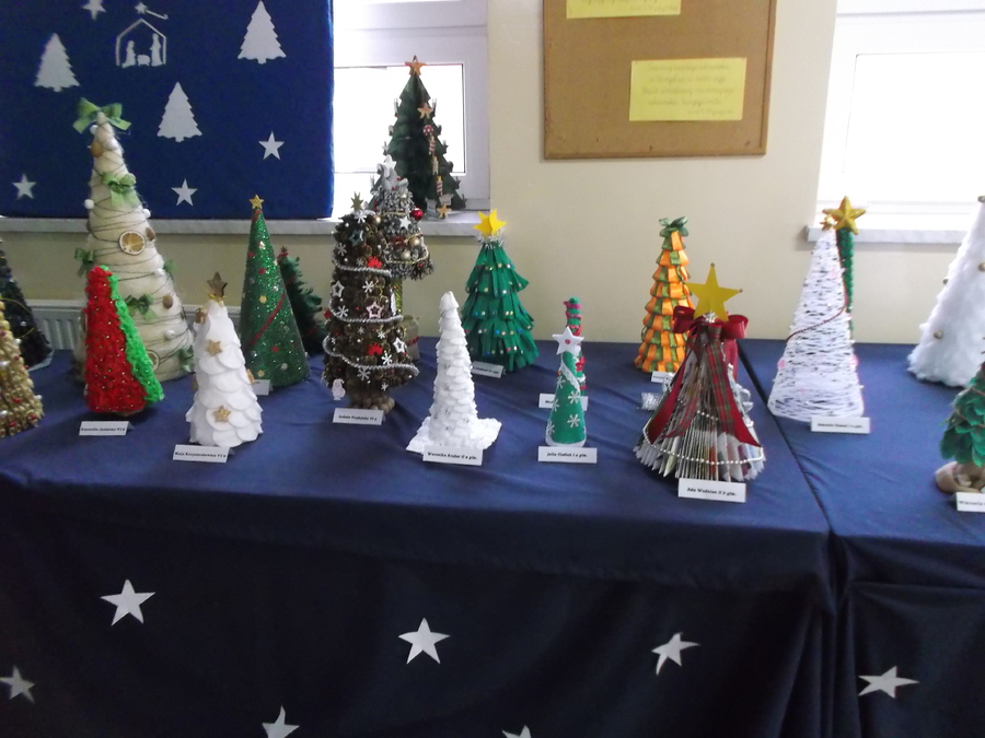 W konkursie udział wzięło 54 uczniów. Wszystkie choinki zostały wykonane bardzo starannie i z dużą pomysłowością. Stanowiły wspaniałą dekorację świąteczną na naszym szkolnym korytarzu.