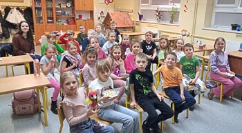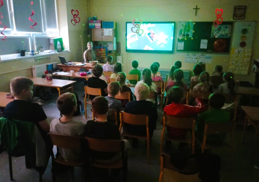 W minionym tygodniu uczniowie podczas zajęć poruszali również tematykę kina i rodzajów filmów. Na zakończenie omawianego materiału uczniowie klasy Ia zaprosili koleżanki i kolegów z klasy Ib do wspólnego seansu filmu. Zaaranżowana klasowa sala kinowa z imitacją rozgwieżdżonego nieba tworzyła odpowiedni klimat do oglądania animowanego filmu pt. „Kosmiczna przygoda”. Jeśli seans w kinie to oczywiście podczas oglądania nie mogło zabraknąć popcornu.
