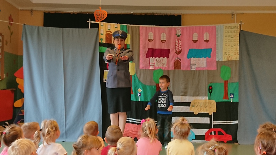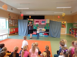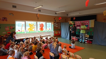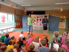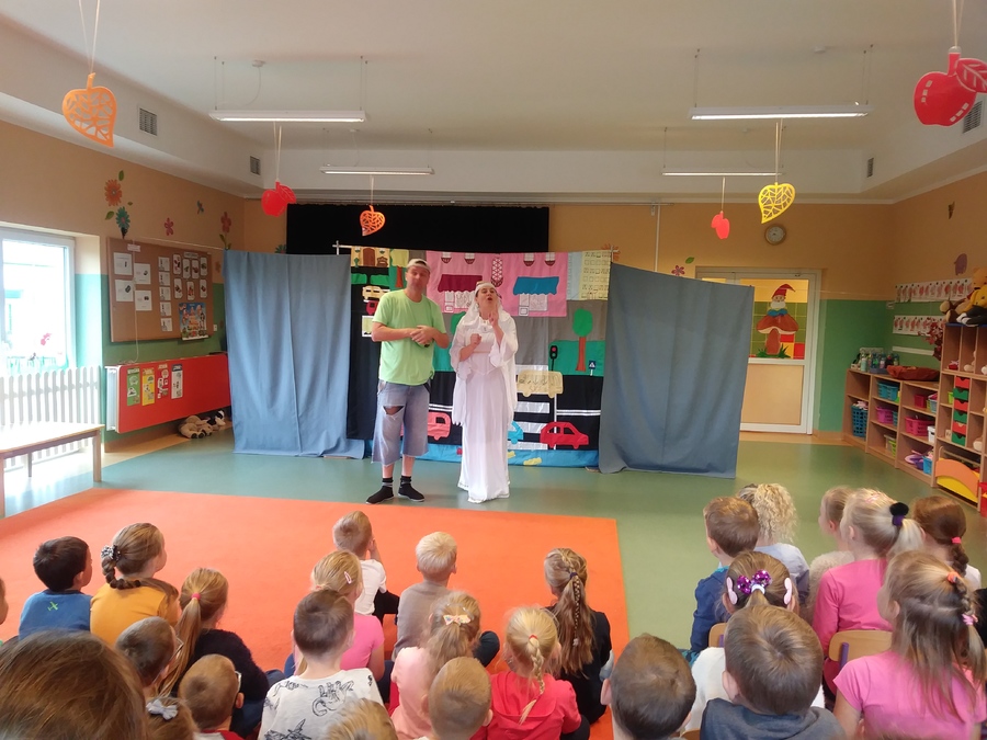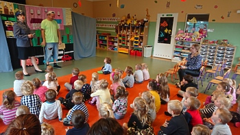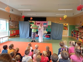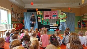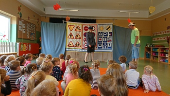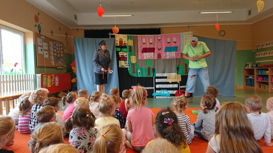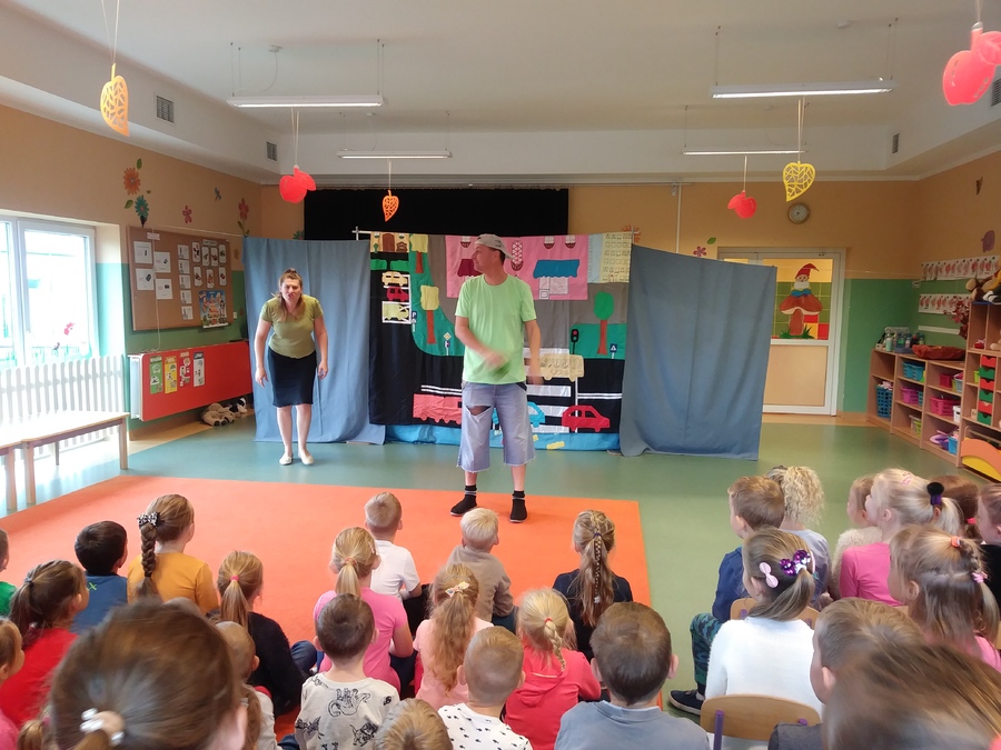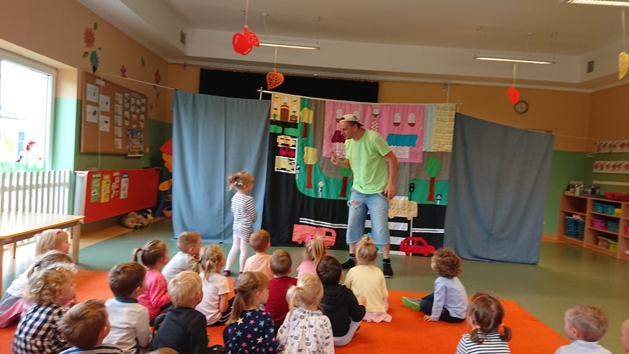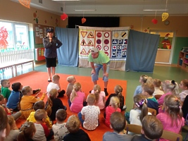 Zaprzyjaźniony z przedszkolem w Trzcinicy Teatr „Dyzio” przyjechał do dzieci 8 października br. z przedstawieniem pt.: „Dyzio na drodze”. Publiczność brała czynny udział w grze aktorów, którzy zadbali o to, aby dzieci mogły zaprezentować zdobyte już w przedszkolu wiadomości o znakach drogowych i pracy policjanta. Scenografia przedstawiająca różne sceny z ruchu drogowego łącznie ze znakami drogowymi pozwoliła przedszkolakom przeżyć ciekawe wrażenia artystyczne i utrwalić zdobyte wiadomości.