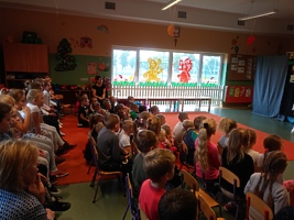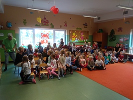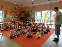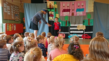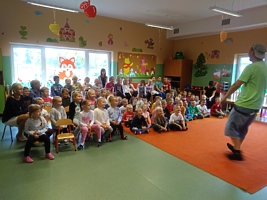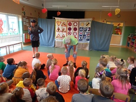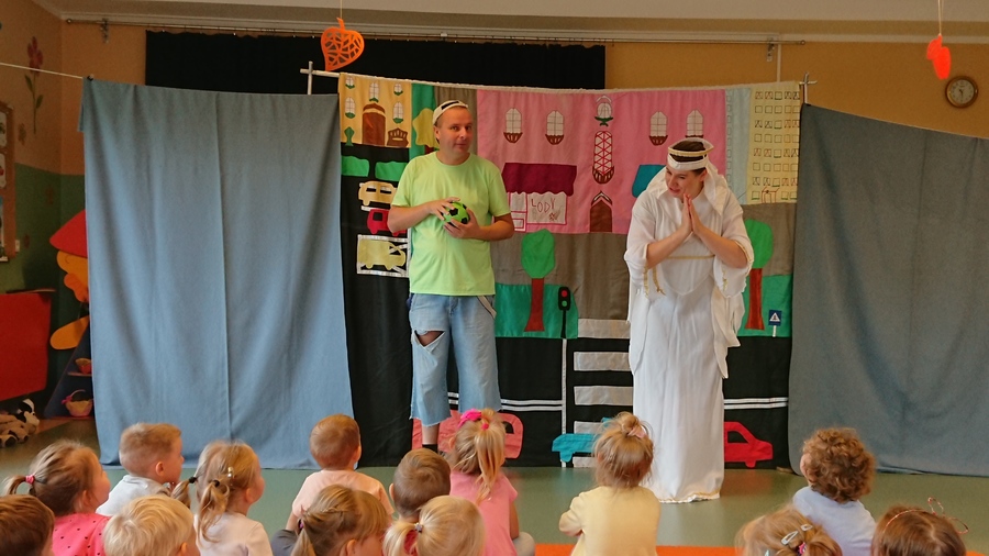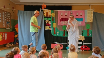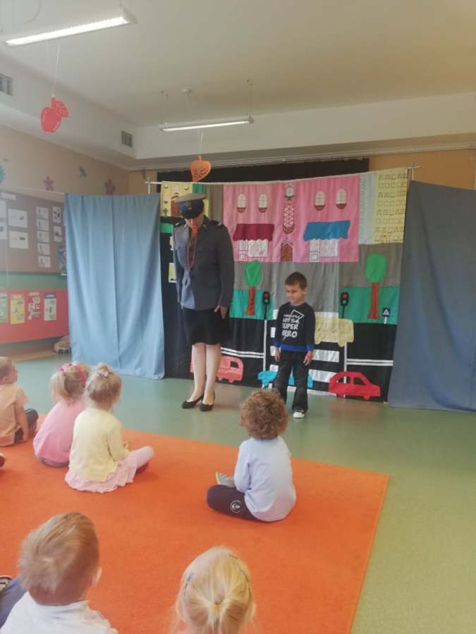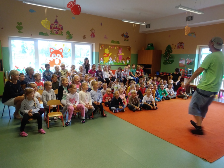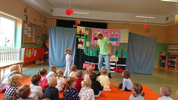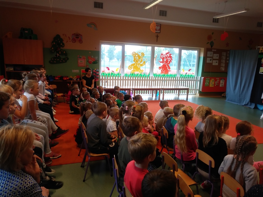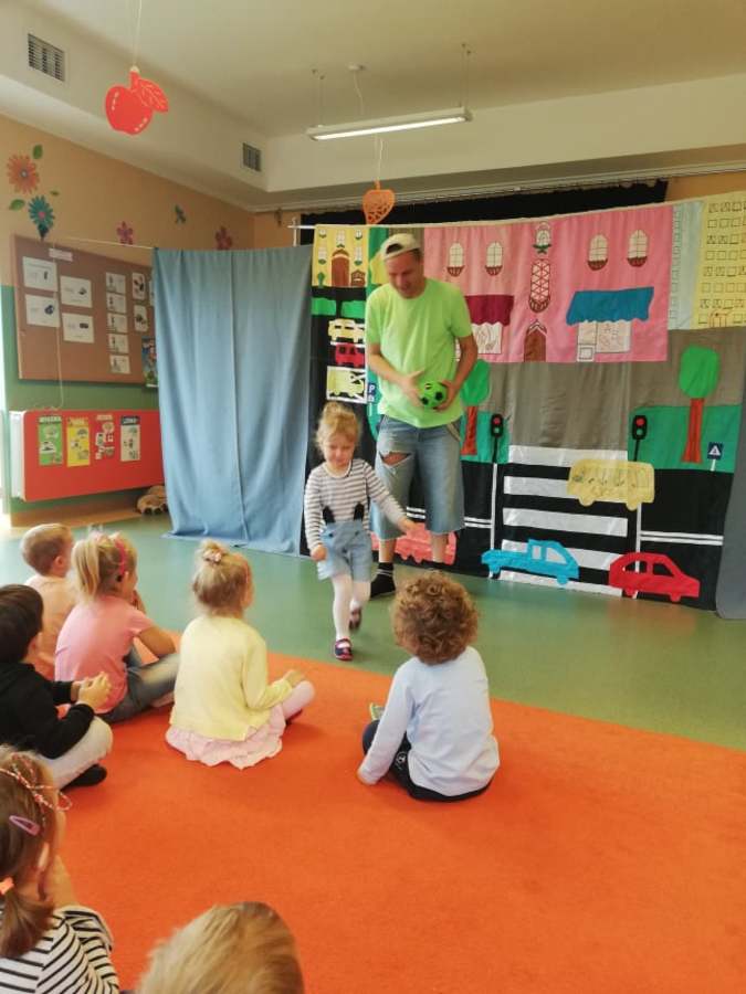 Zaprzyjaźniony z przedszkolem w Trzcinicy Teatr „Dyzio” przyjechał do dzieci 8 października br. z przedstawieniem pt.: „Dyzio na drodze”. Publiczność brała czynny udział w grze aktorów, którzy zadbali o to, aby dzieci mogły zaprezentować zdobyte już w przedszkolu wiadomości o znakach drogowych i pracy policjanta. Scenografia przedstawiająca różne sceny z ruchu drogowego łącznie ze znakami drogowymi pozwoliła przedszkolakom przeżyć ciekawe wrażenia artystyczne i utrwalić zdobyte wiadomości.